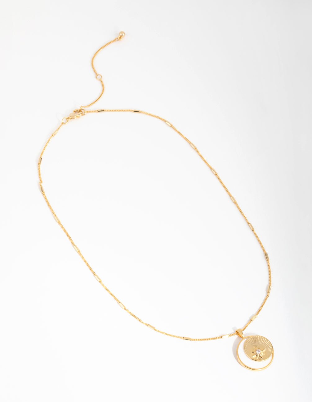 Celestial, talisman and tarot-inspired pieces: a collection of vintage-inspired jewellery designed to be kept and treasured. This lovely necklace is plated with genuine 18ct gold for authentic lustre and shine. It features a crescent-moon pendant with shell details and a cubic-zirconia starburst design. Beautiful and dainty, this ethereal piece evokes an otherworldly charm.
