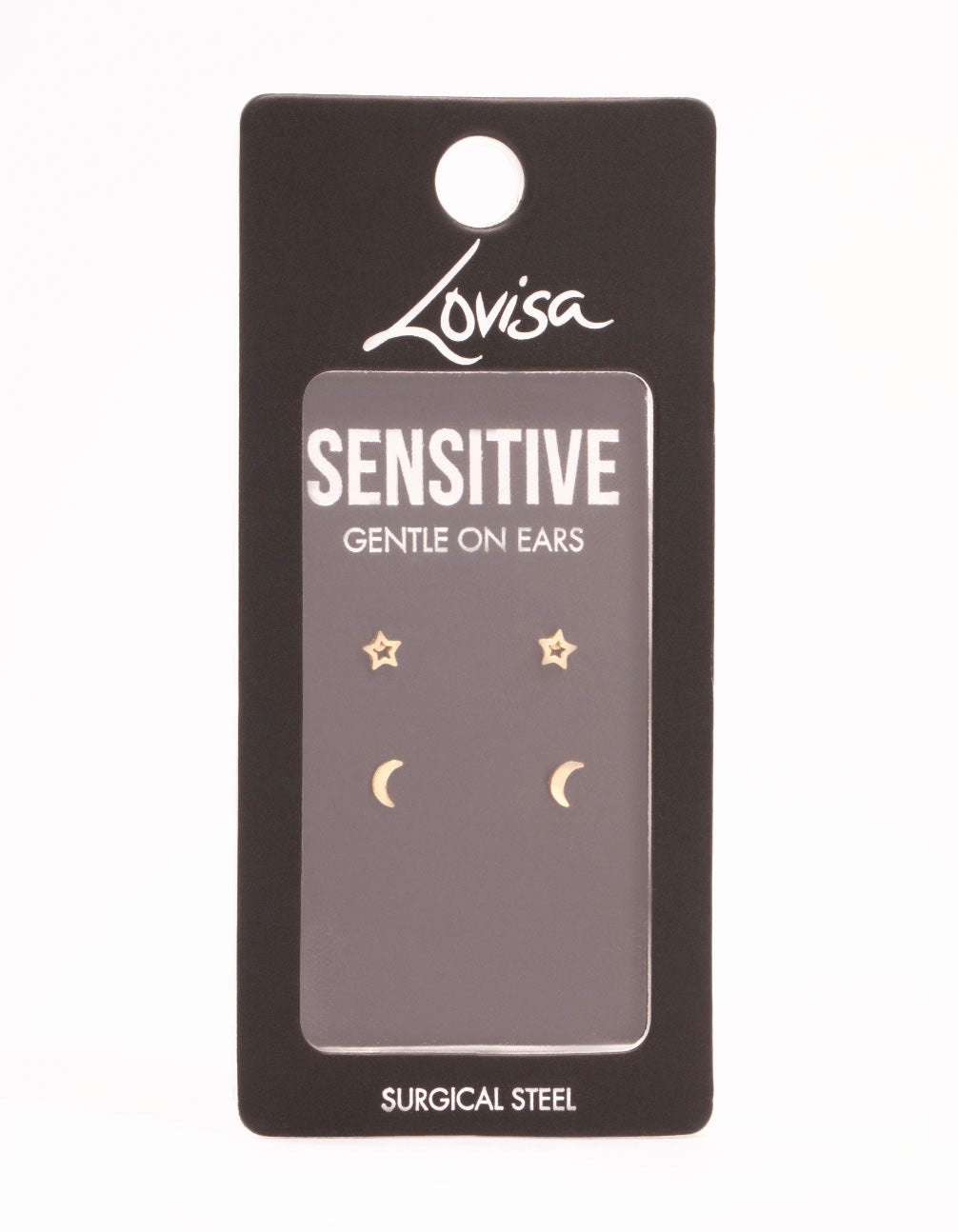 Designed with sensitive skin in mind, the Lovisa Sensitive Jewellery Collection utilises premium materials that reduce the risk of irritation. These studs are made with surgical steel so they're gentle on skin. They're plated with genuine gold for authentic lustre and shine. They feature star and moon designs.