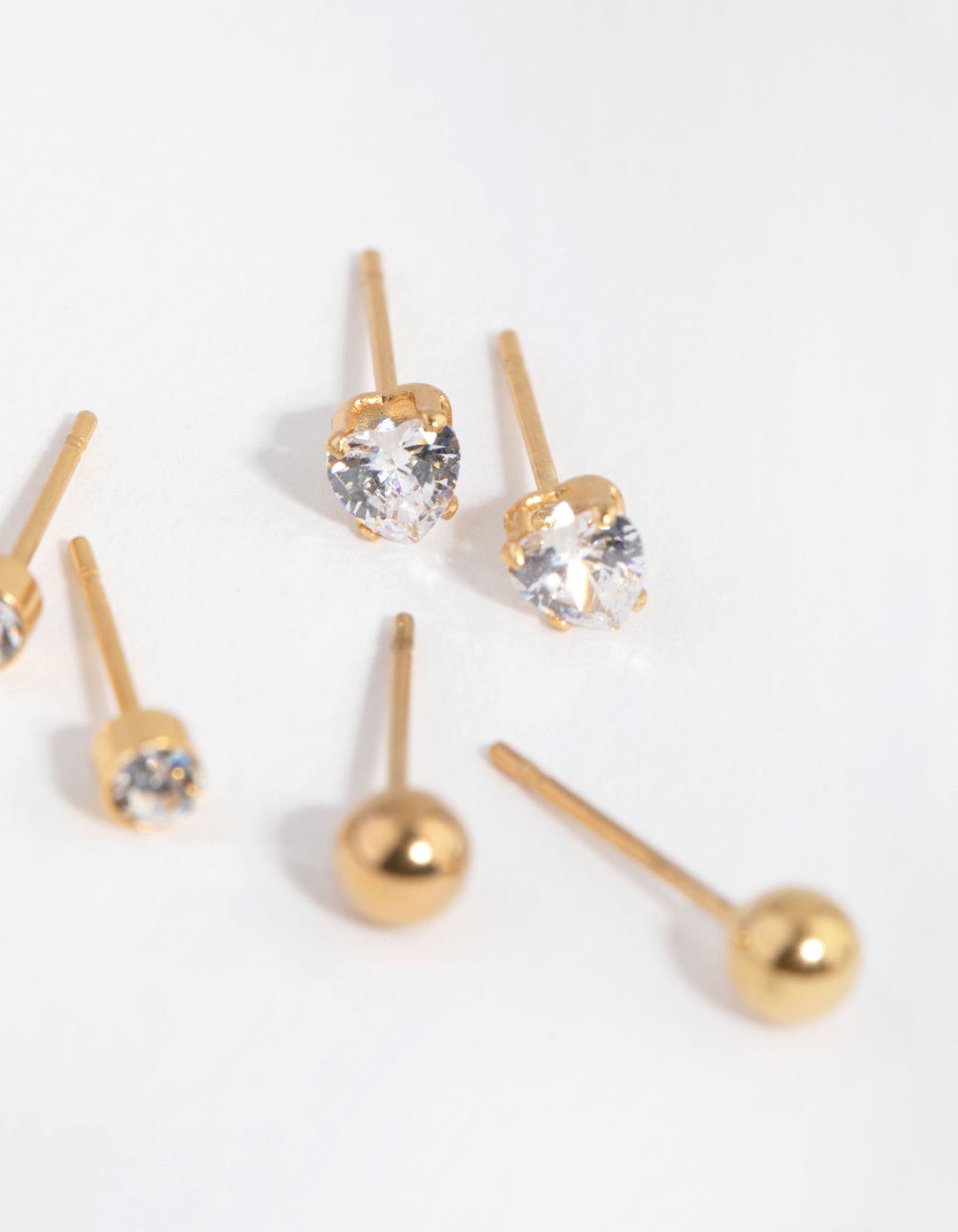 Be spoiled for choice with this set of three pairs of dainty titanium studs that have been plated with genuine 24-carat gold. This set features a cute heart design as well as simple diamante and polished ball studs. Stack and layer to your heart's content.