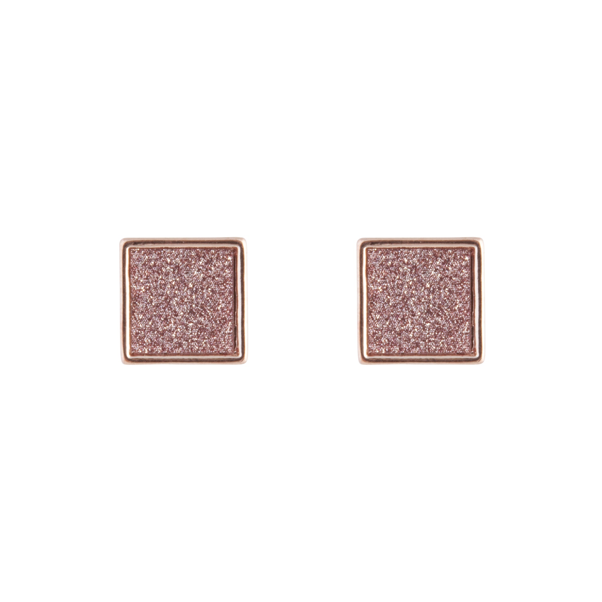 A pair of square shaped rose-gold-toned stud earrings with pink glitter.