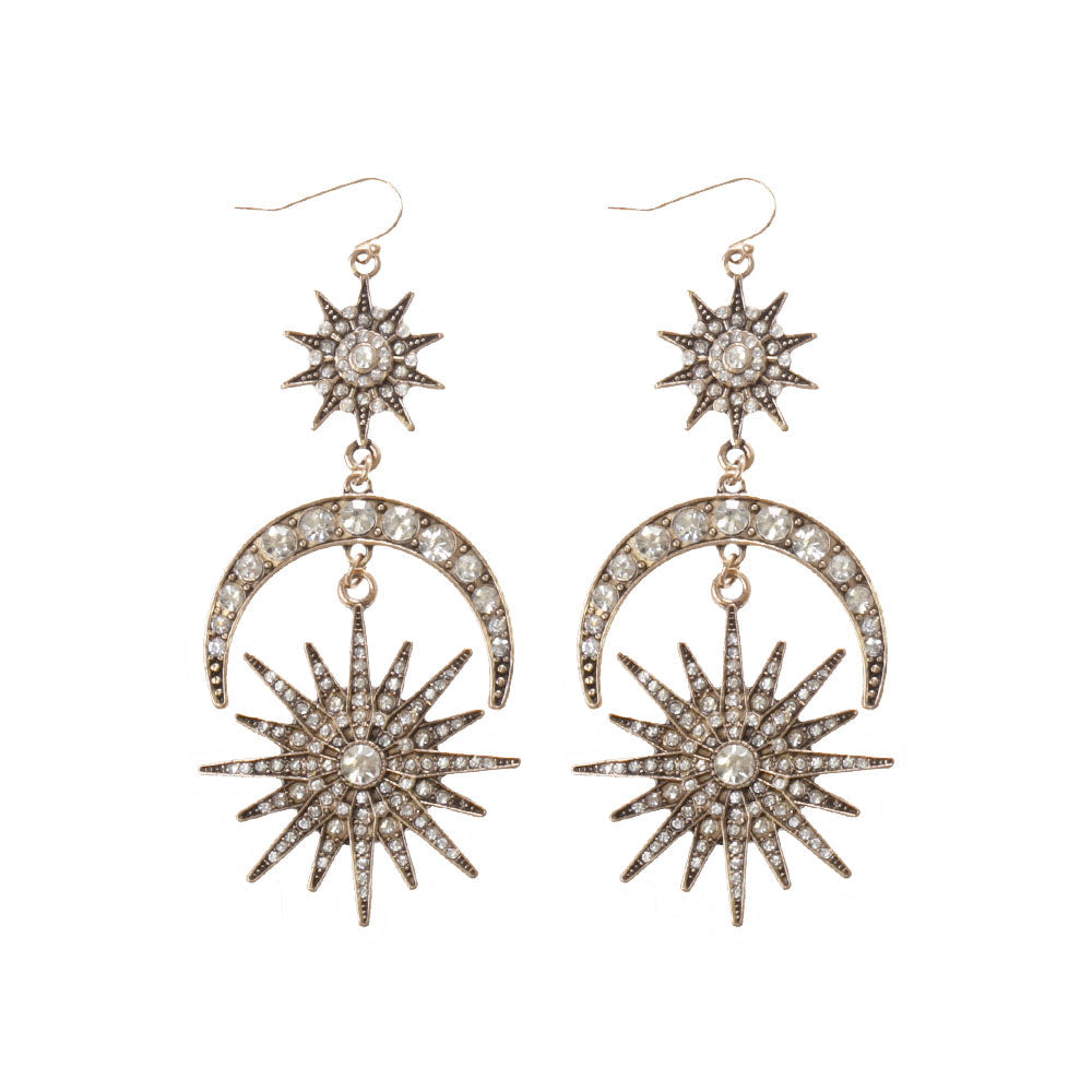 Take the Moon and the Stars with you wherever you go! Our Celestial Statement earring is embellished with twinkling crystals on dramatic starburst and half moon gold tone settings. Perfect for any time of Night or Day!
