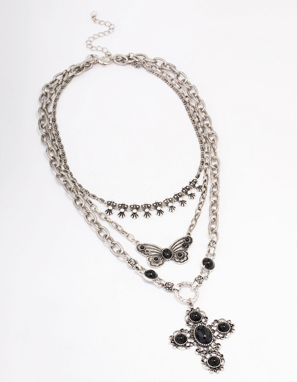 Antique Silver Butterfly Cross Stone Layered Necklace