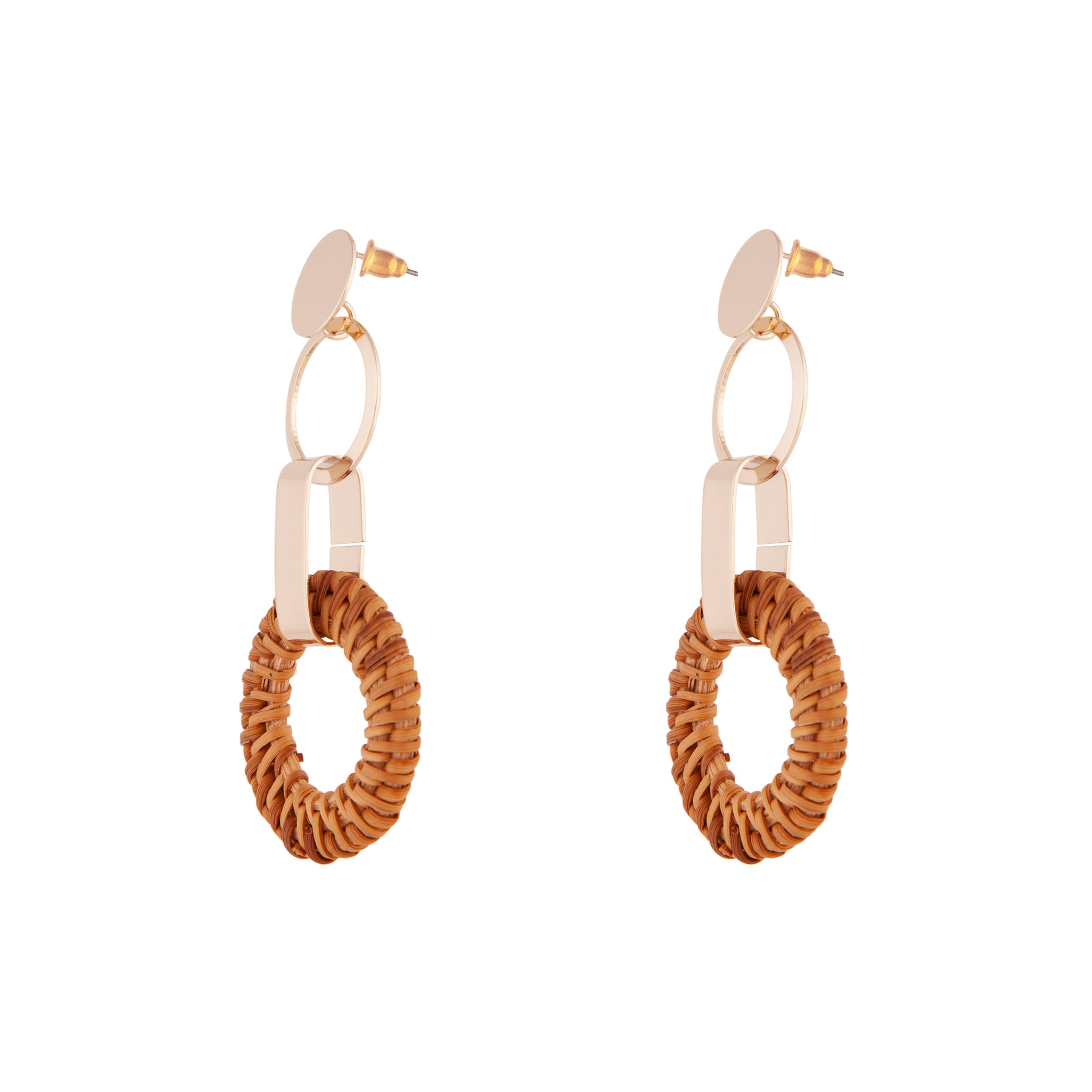 Show your love for summer in these brown and gold-toned raffia earrings.