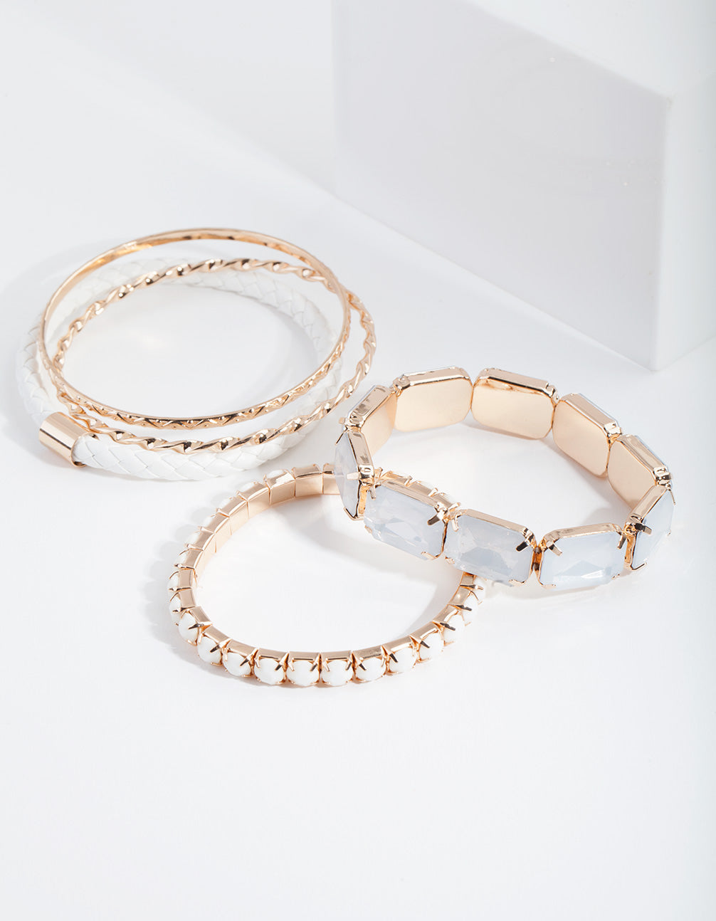 Split this set up or wear all-together for an opulent look. This set gives you so many options to wear and comes with a mixture of textures in a gold-tone so you can switch it up daily. The bracelets feature an elastic stretch and a mixture of designs incorporating faux jewels and braided faux leather matched with textured gold-toned non-stretch bangles. Wear them anywhere, and to any occasion!