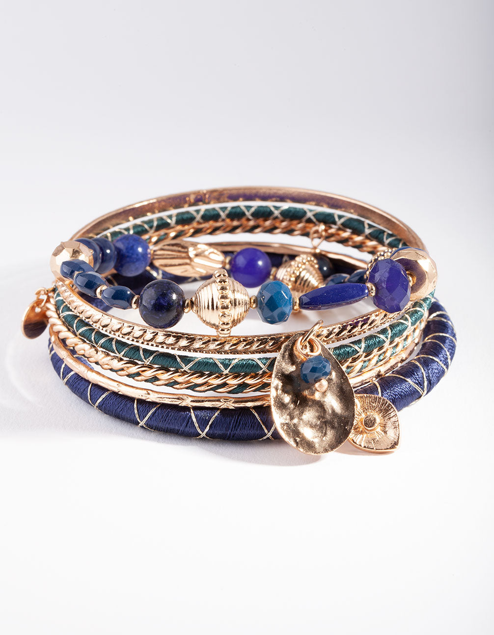 Stack up the style with a Lovisa wrist pack. This bracelet pack comes with 7 styles in deep blue and gold tones with a tread-wrap and charm embellished design.