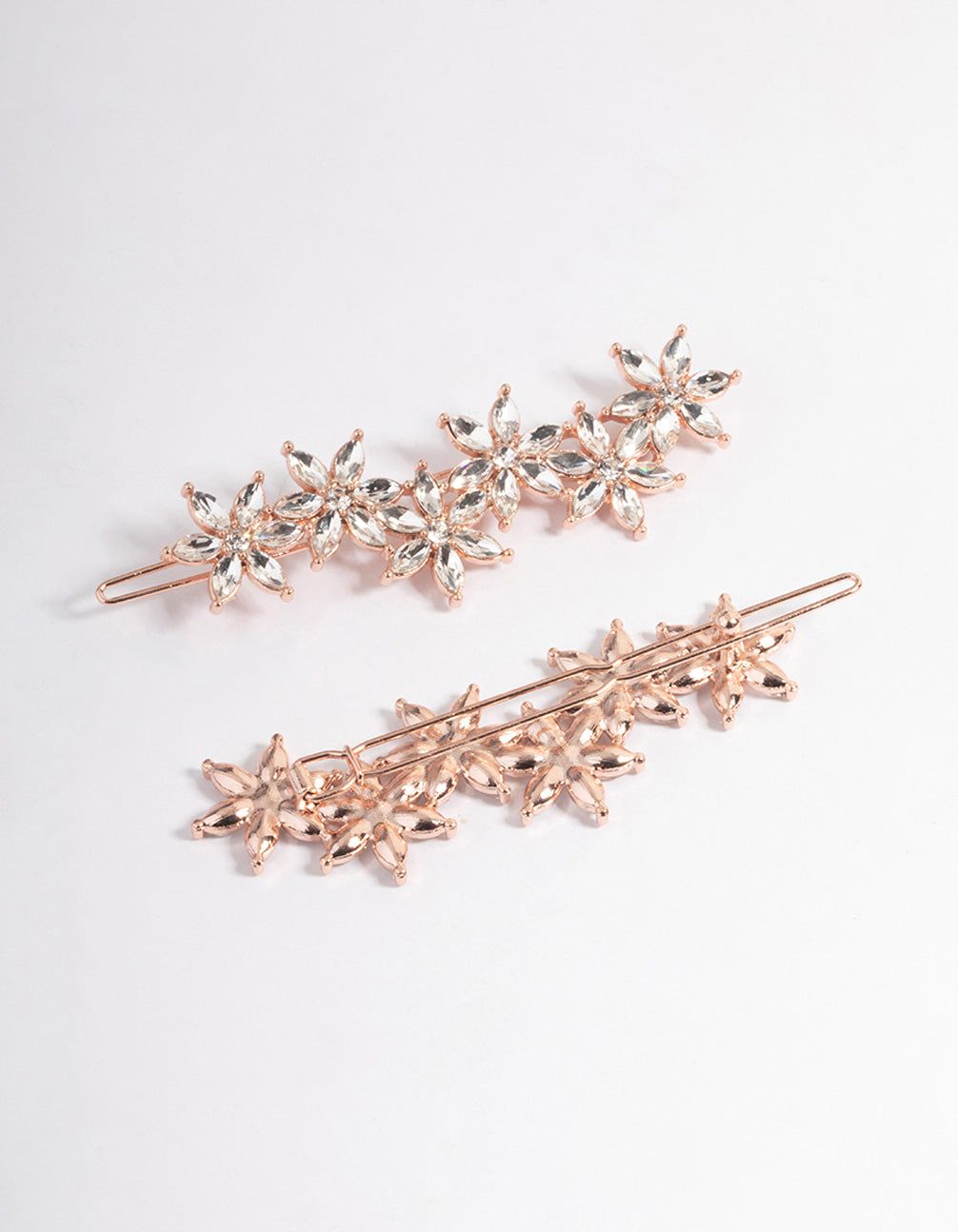 - This set of two, rose gold-toned hair clips are designed with diamante-encrusted flowers for a glamorous, feminine touch.