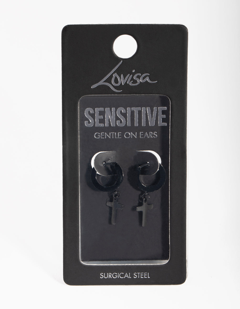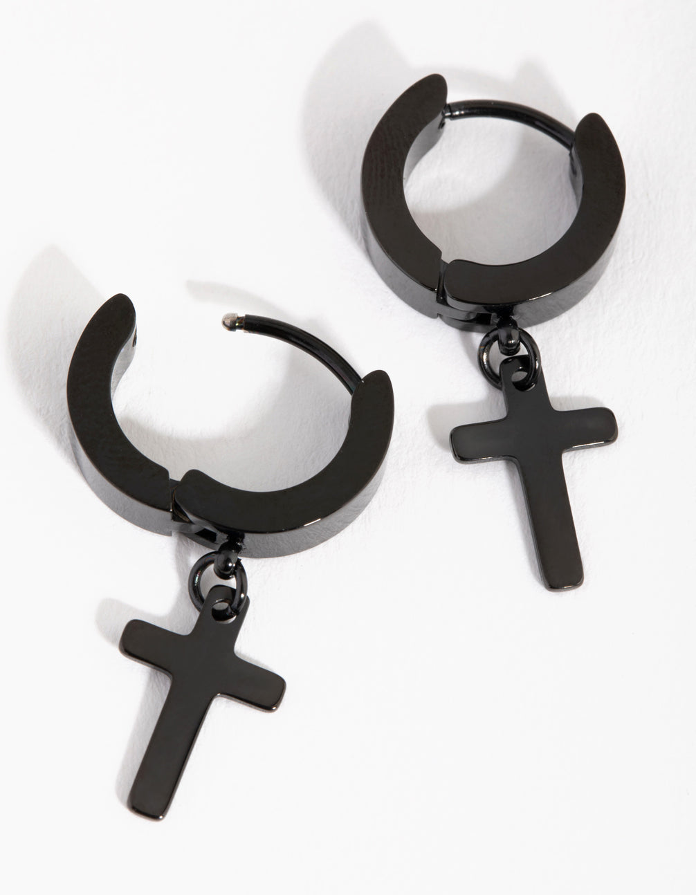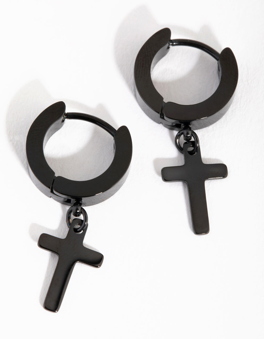 Embrace edge with these black huggie earrings. These edgy earrings are crafted using black coated surgical steel for hypoallergenic wear and a a bold dangling cross motif.