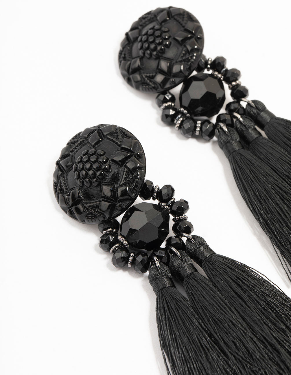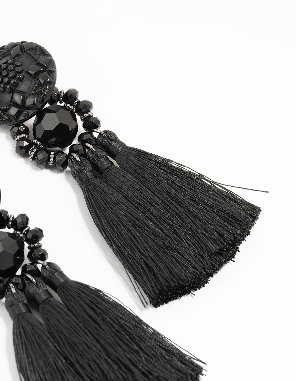 Make a bold statement with these edgy black tassel fabric drop earrings. Perfect for those daring moments, the textured tassels add an intriguing touch.