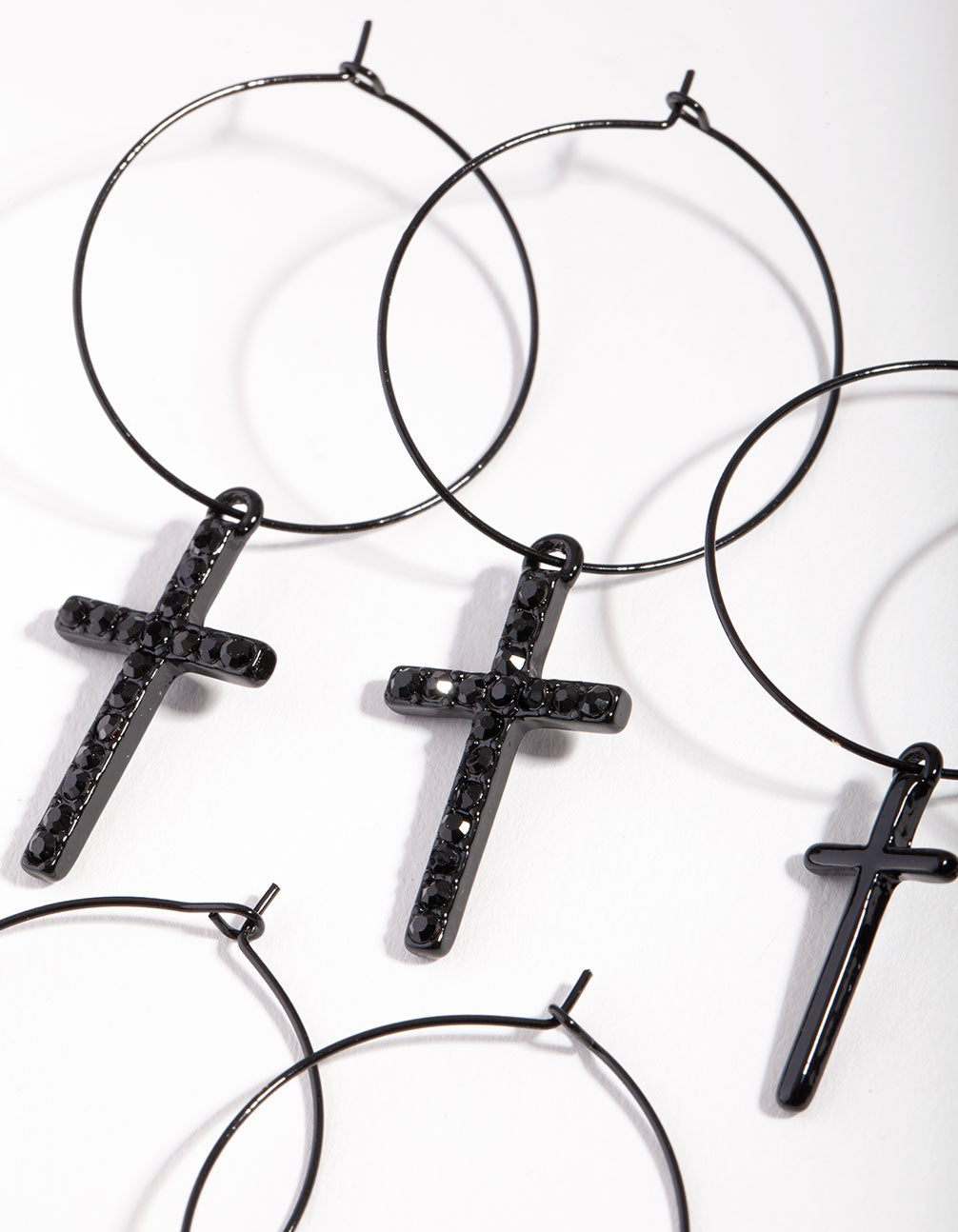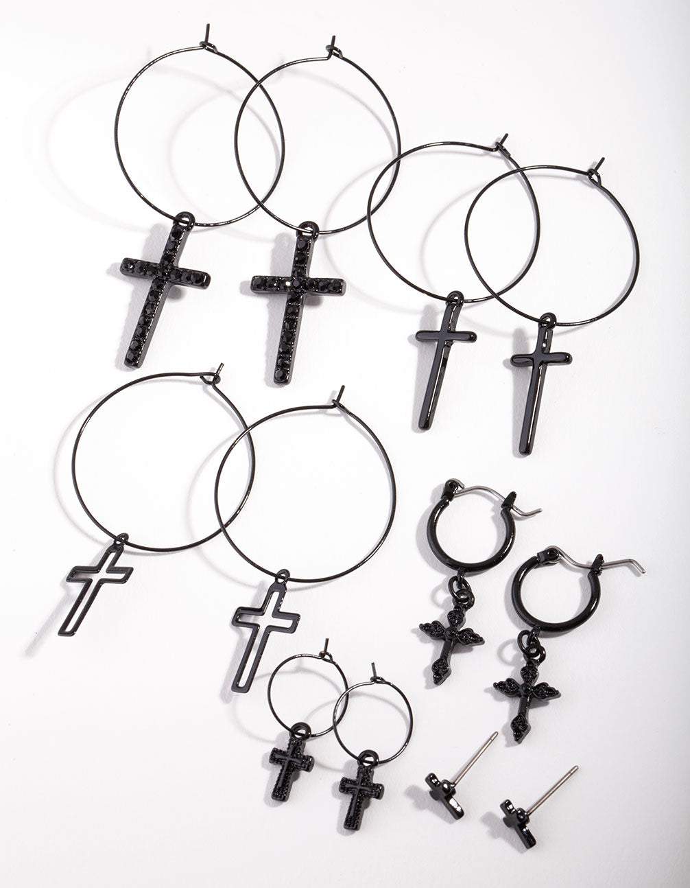 Can't decide on just one? You don't have to! This style features a variety of earrings so you can mix and match to suit your mood. This pack comes with black-toned designs with a cross motif.