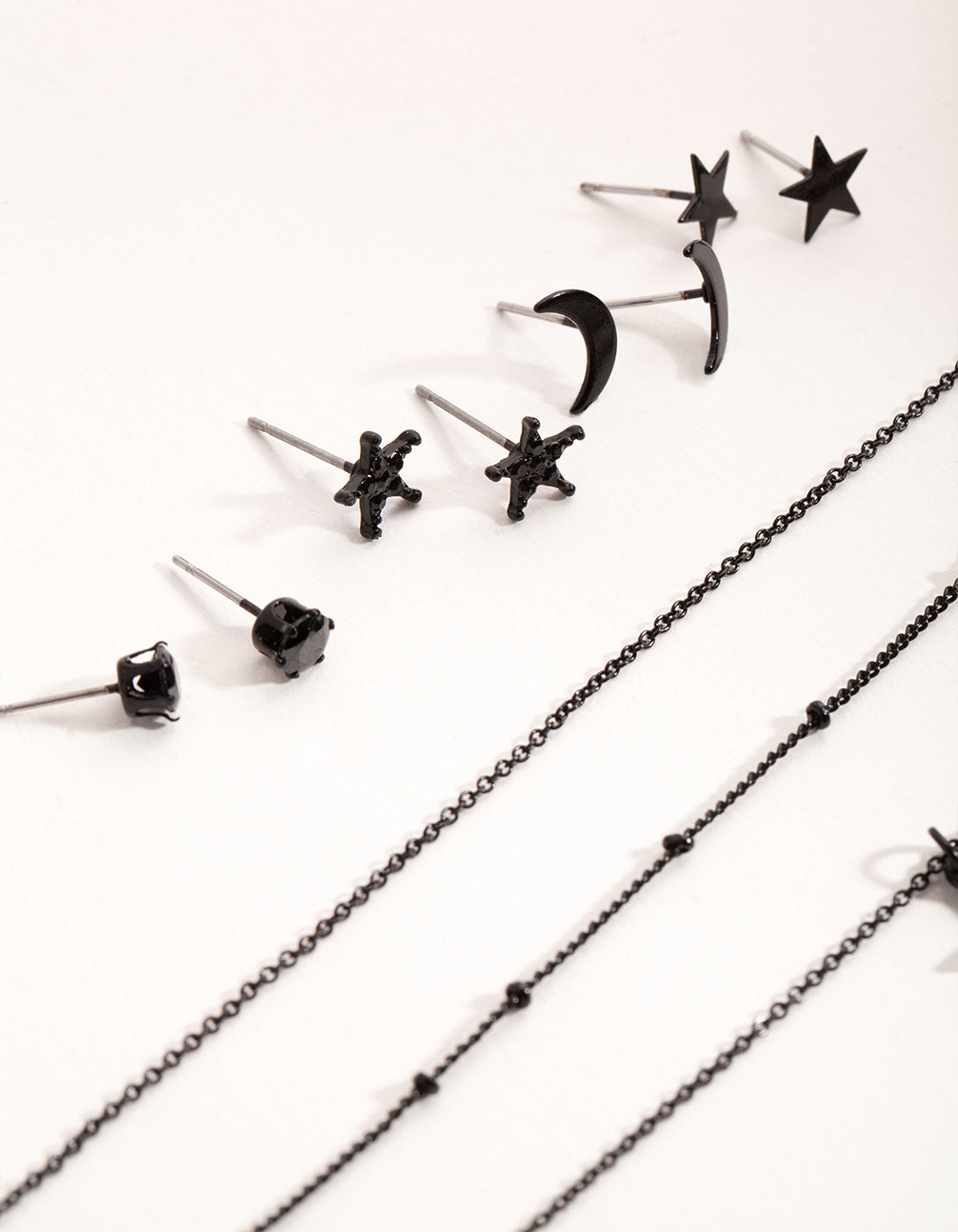 Round out your collection with a fashion-forward earring and necklace pack. This set includes five chokers and four stud earrings, with celestial motifs on a matte black setting. Stack and layer to your hearts content!