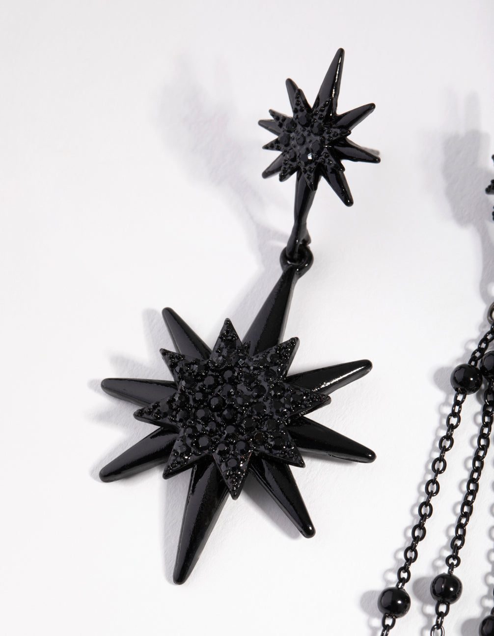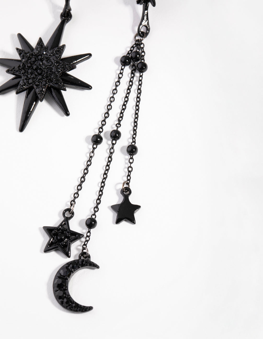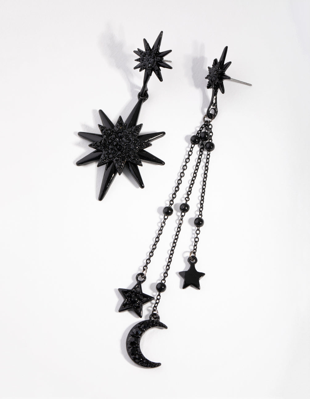 We love a celestial moment! These drop earrings feature diamante-embellished moon and star charms in a mismatched, matte-black pattern. Pair with your favourite evening outfit for a considered look.