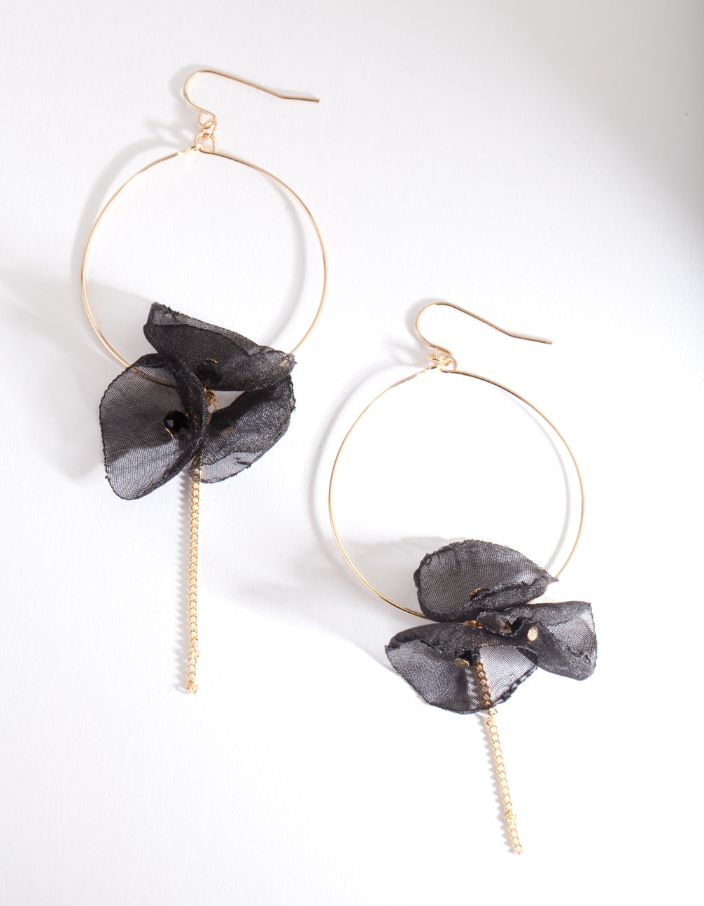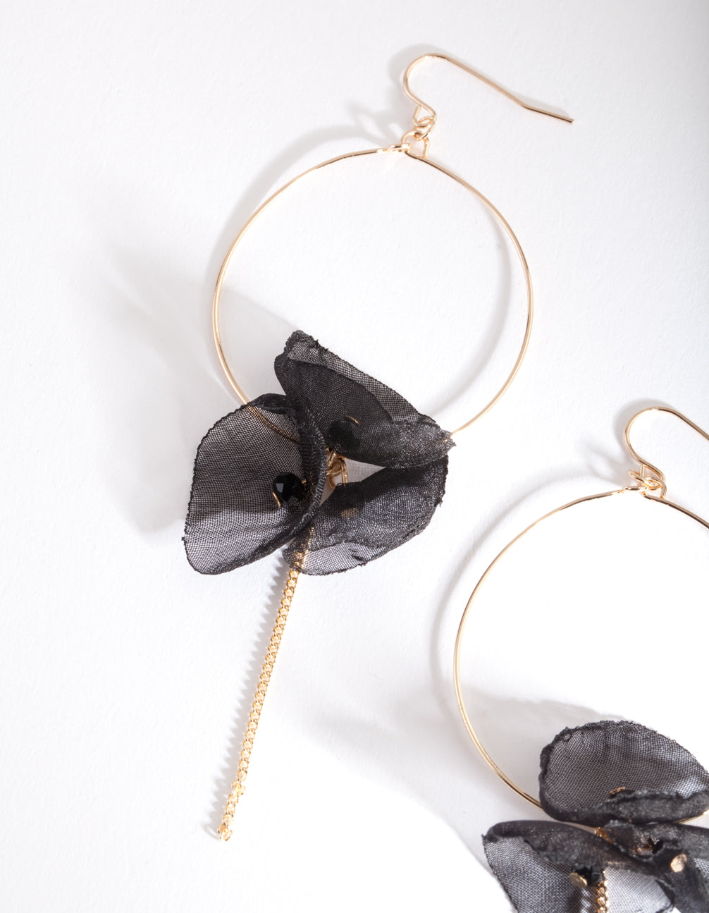 Statement earrings have become the easiest way to switch up any wardrobe. Conversation-starting styles mean that a new pair of earrings replaces the need for a new dress. These hoop earrings feature a gold-toned black fabric flower design. Style with dainty gold rings and layered necklaces for a delicate look.