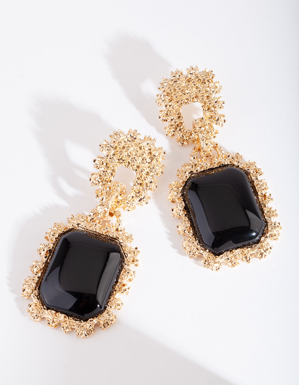 Statement earrings are the easiest way to switch up your wardrobe! Conversation-starting styles mean that a new pair of earrings replace the need for a new dress. These gold-toned earrings boast a dramatic 7.8cm drop and a textured border with a rectangular black enamel feature stone. Style with gold rings, sleek hair and a bold lip for a statement look.
