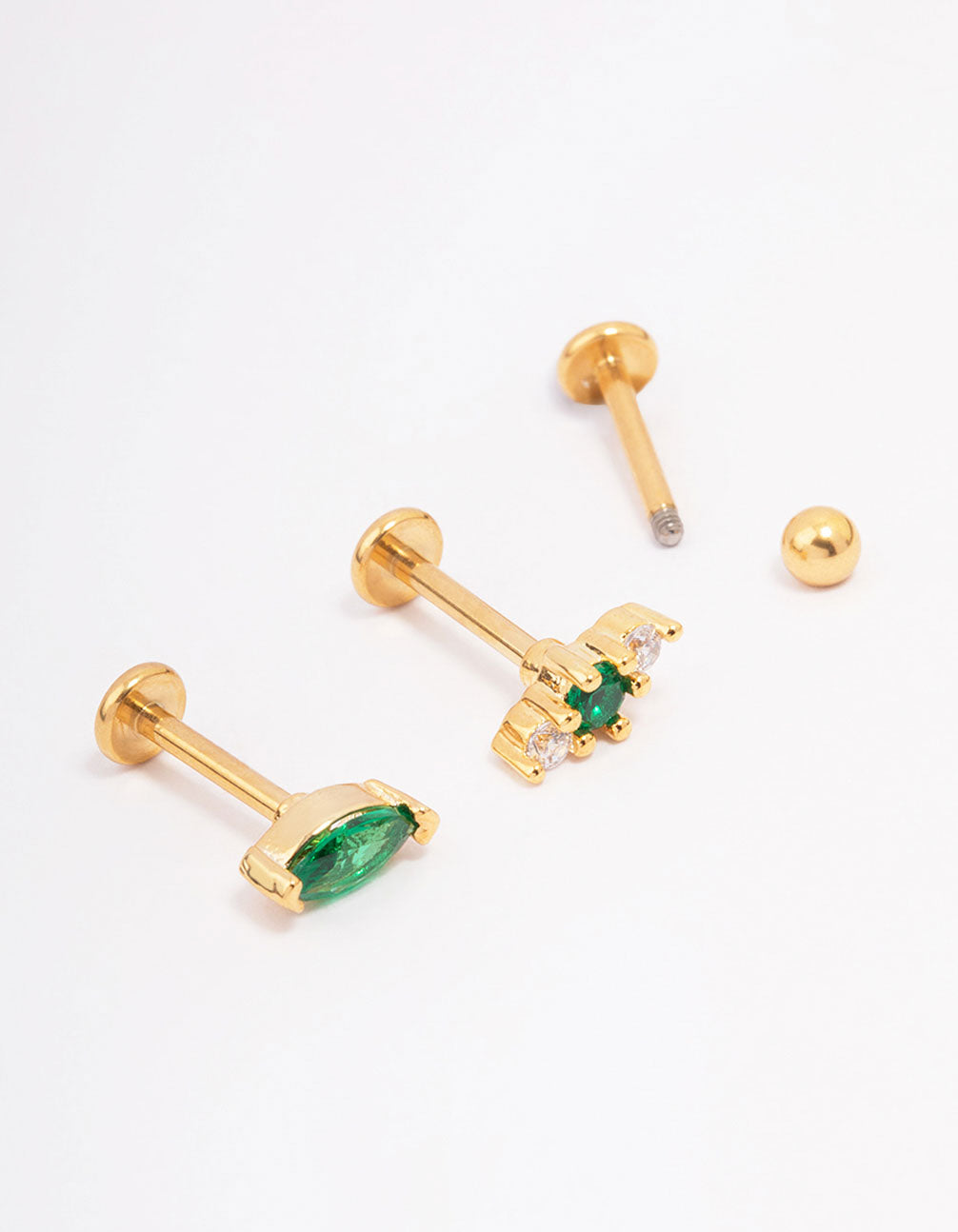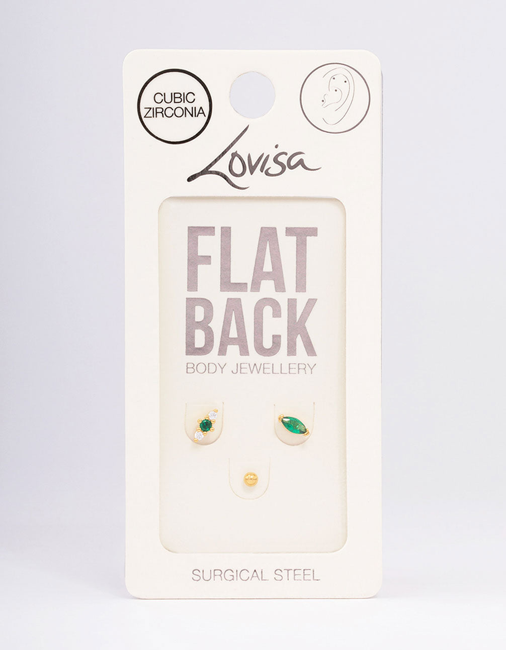- This gold plated flat back pack contains three embellished piercings, featuring green marquise crystals, a simple round ball and cubic zirconia attachments. Style these flat backs as helix, cartilage or tragus piercings.