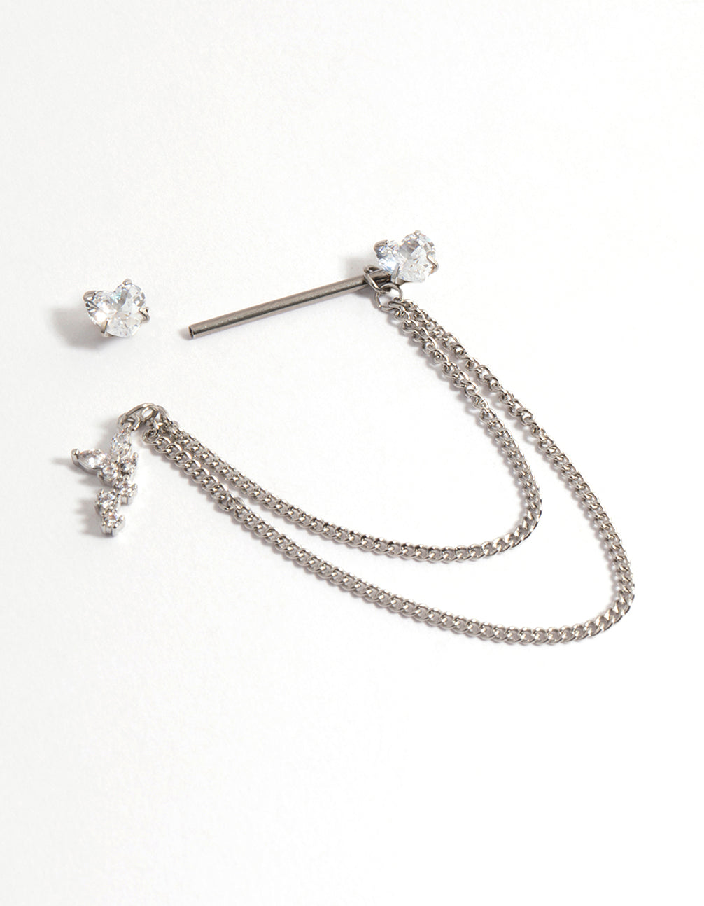 - This nipple piercing features a silver, surgical steel setting and features delicate cubic zirconia crystals on a dainty chain for added detail.