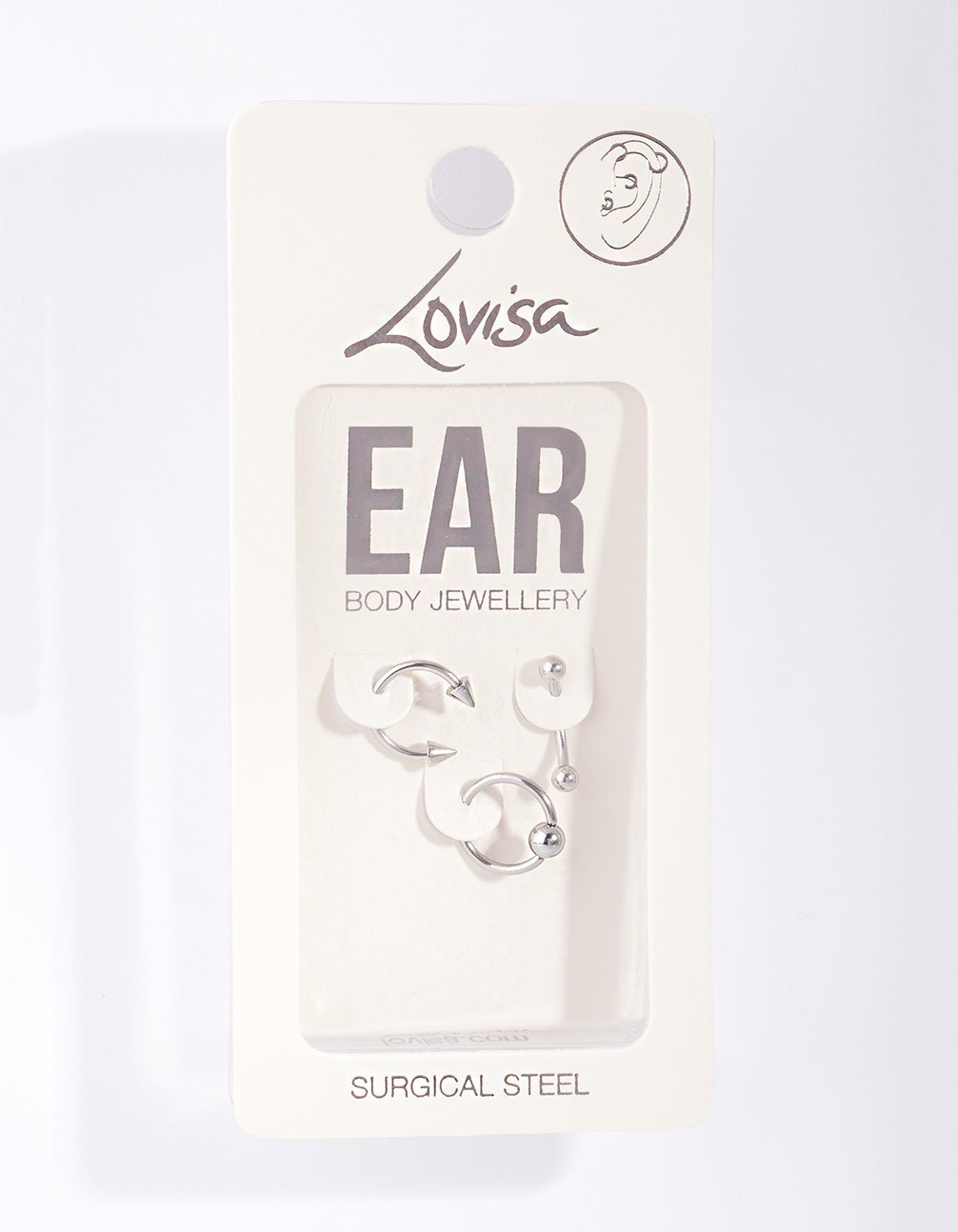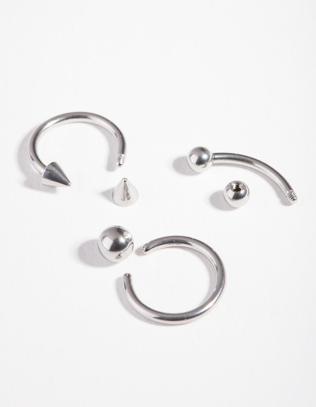 This trio of body jewellery rings come in a variety of spike and ball designs. They are made with surgical steel for easy everyday wear. Cartilage earrings look great as helix, conch and tragus piercings. Wear the earring set on it's own or stack multiple piercings with other sterling silver designs (eg. hoops, huggies, studs etc.)