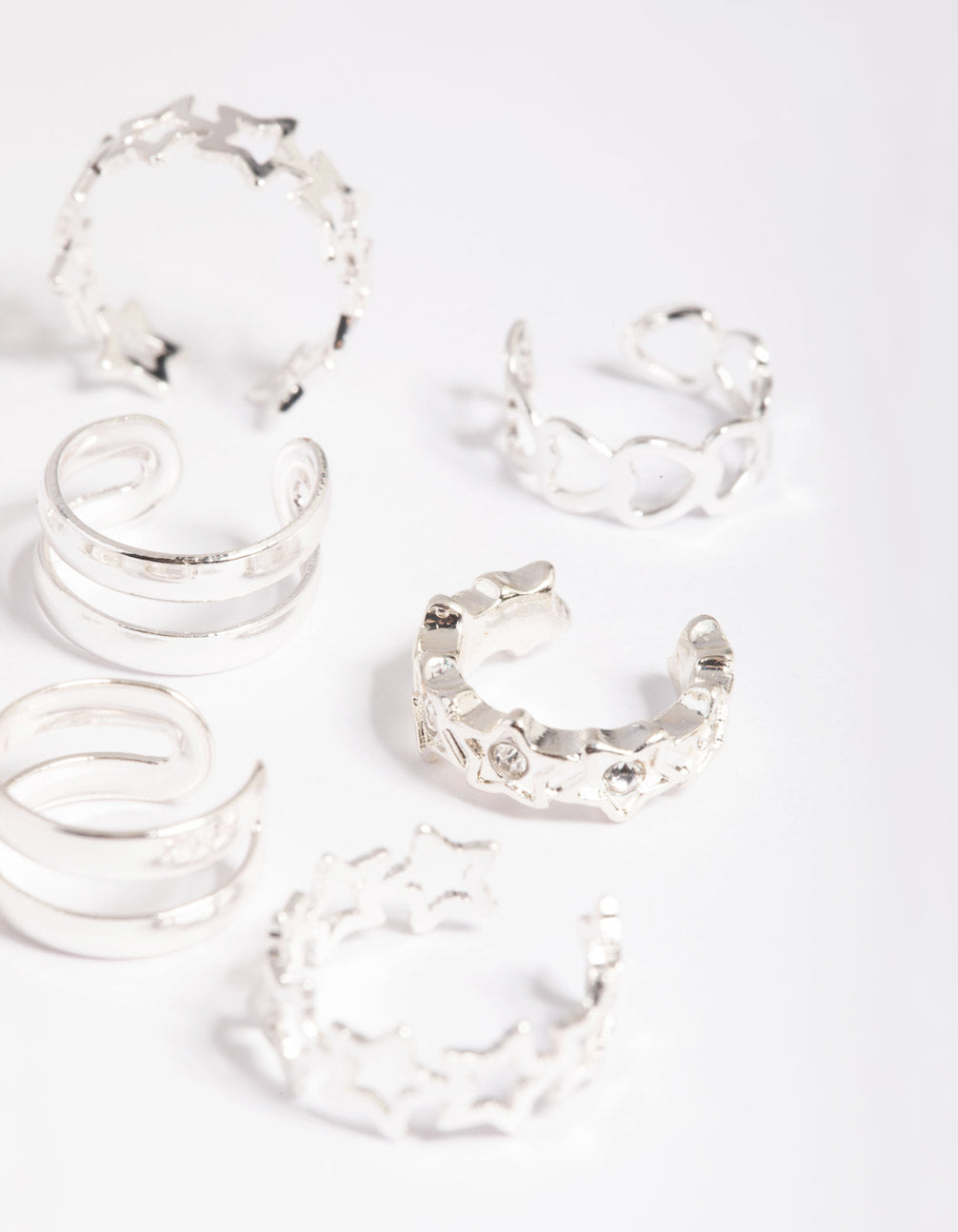Mix them, match them, stack them! Our earring packs are designed to be layered. This silver-toned set includes eight earrings with star and heart motifs. Get your ear stack started and get creative!