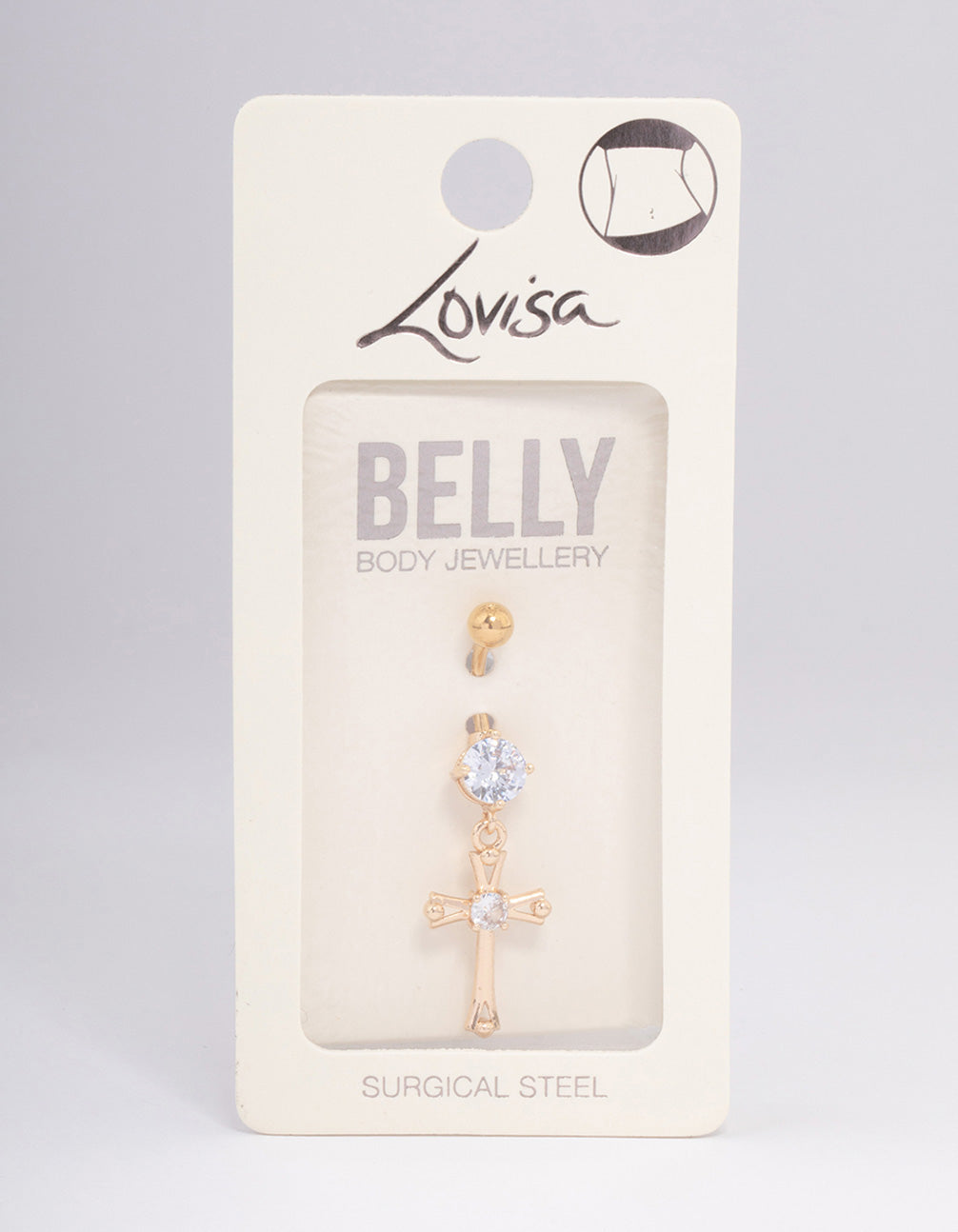 Gold Plated Surgical Steel Cubic Zirconia Cross Drop Belly Ring