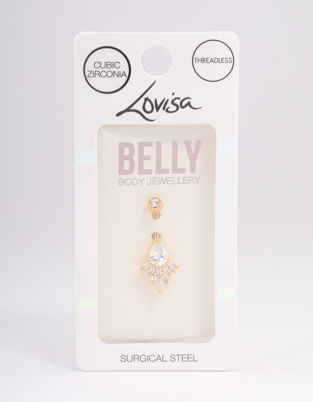 Gold Plated Surgical Steel Cubic Zirconia Pear Fanned Threadless Belly Bar
