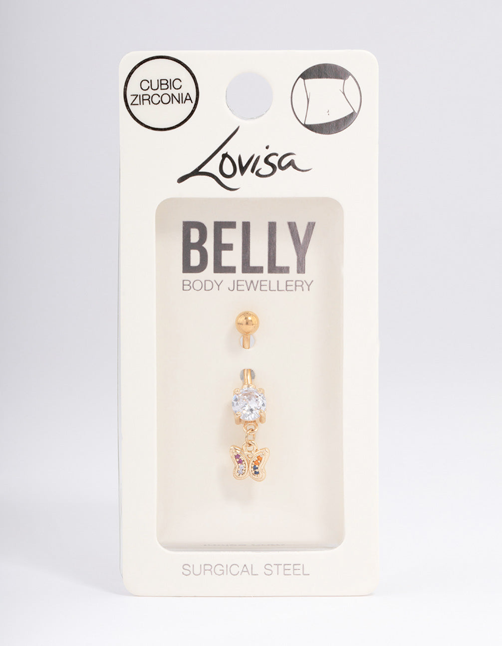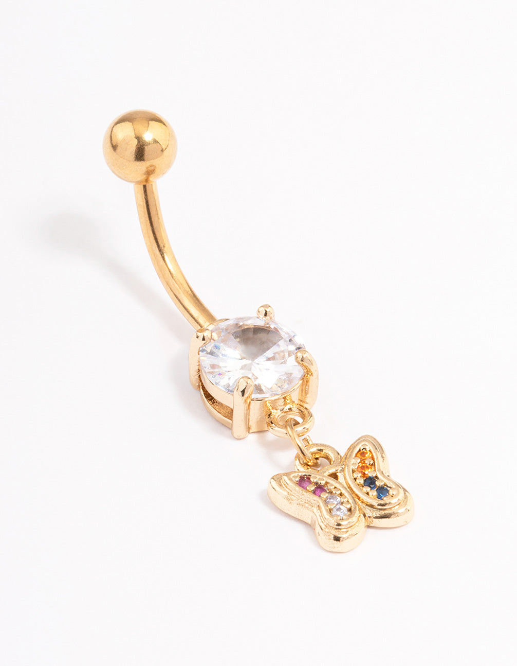 Gold Plated Surgical Steel Cubic Zirconia Rainbow Butterfly Belly Ring