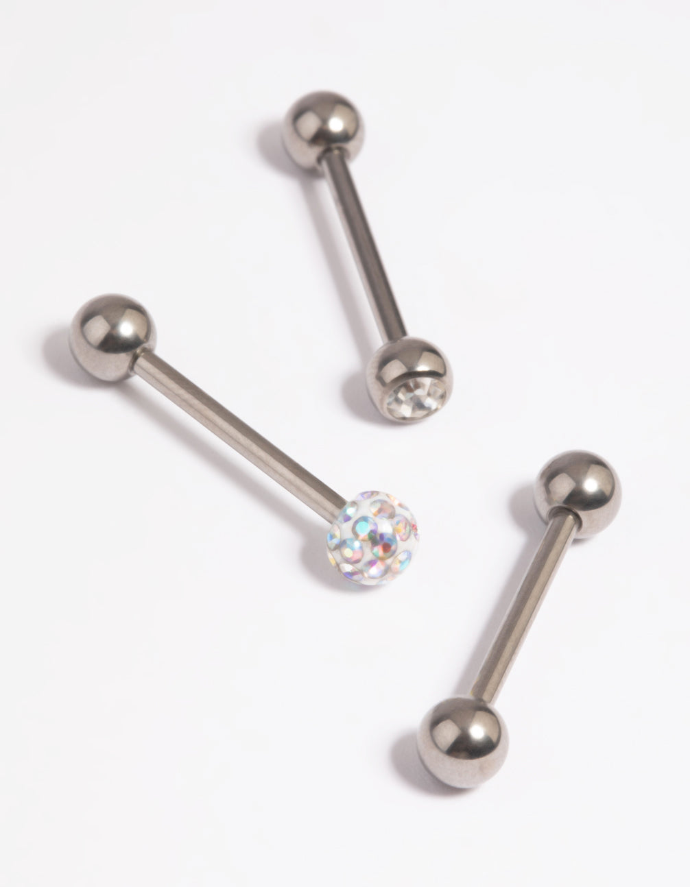 Show off your individuality with Lovisa body jewellery! Our premium body jewellery is made with quality titanium to avoid skin irriation and ensure pieces are comfortable for day-to-day wear. This pack includes multiple tongue rings. They measure 14G/1.6mm.