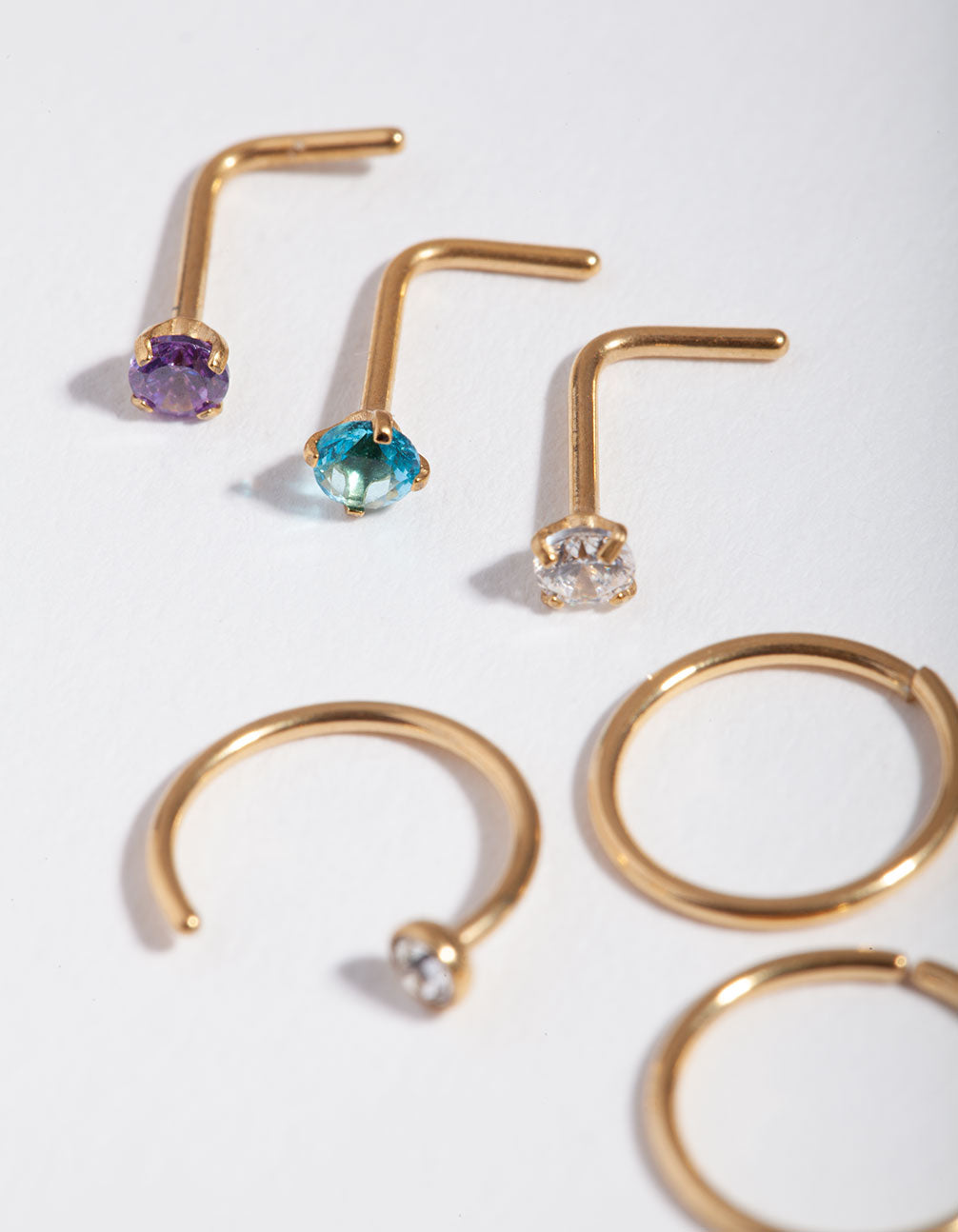 Lovisa body jewellery is made from surgical steel, which means it's gentle on your skin and perfect for daily wear. This set includes six nose studs and rings, adorned with colourful diamantes.