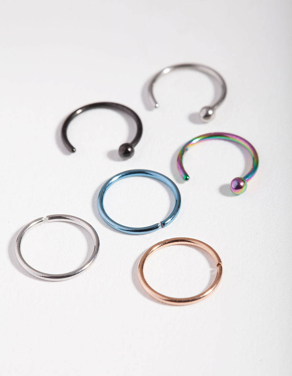 Stack and layer with this curated nose piercing pack! This set includes six hoop nose rings, that feature an open ball shape in a range of fashion-forward colours. They have a gauge of 20 and are 0.8mm in length.