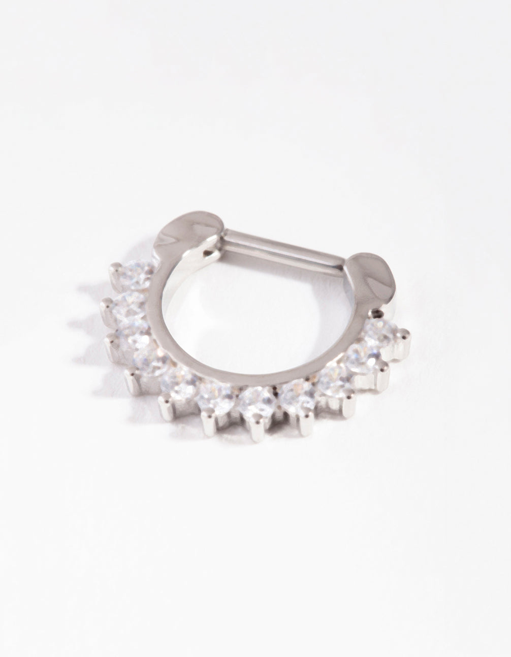 Round out your collection with a trendy septum piercing. On a silver-toned setting, this piece is sun shaped and adorned with stunning cubic zirconia stones. It has surgical steel posts. They have a gauge of 16 and are 1.2mm in length.