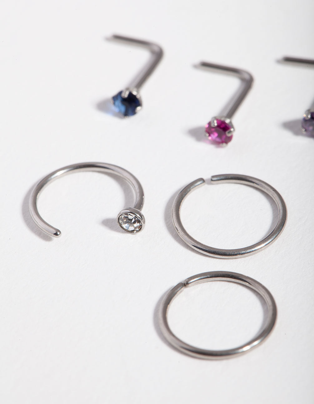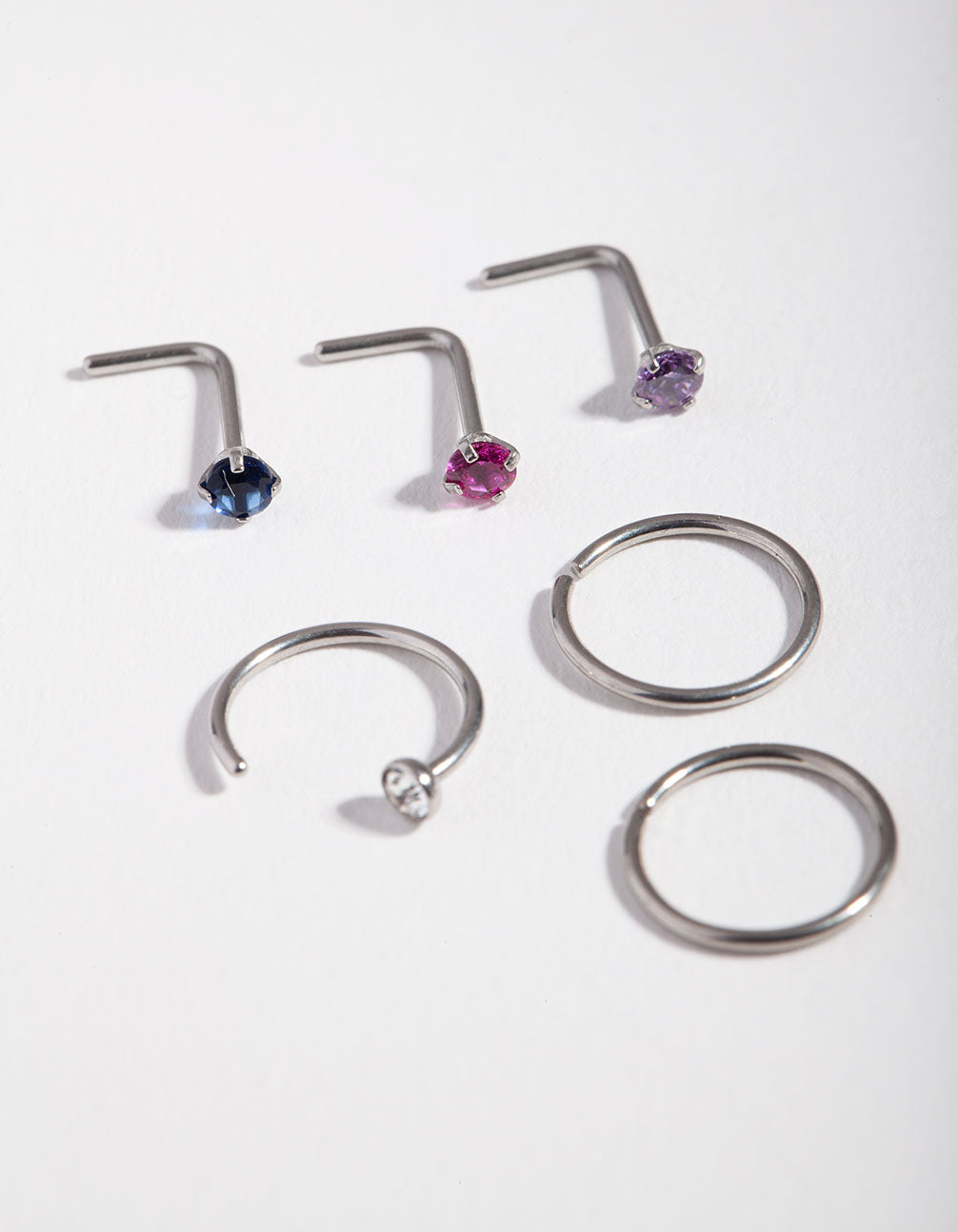 Round out your collection with a nose piercing pack! This set includes six silver-toned piercings with colourful diamante details. Lovisa body jewellery is made from surgical steel, so it's safe to wear and gentle enough for daily use. They have a gauge of 20 and are 0.8mm in length.