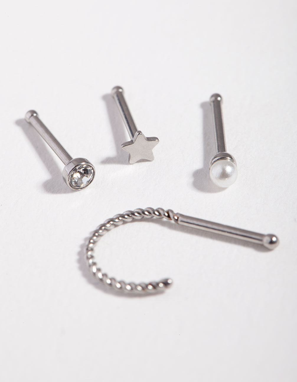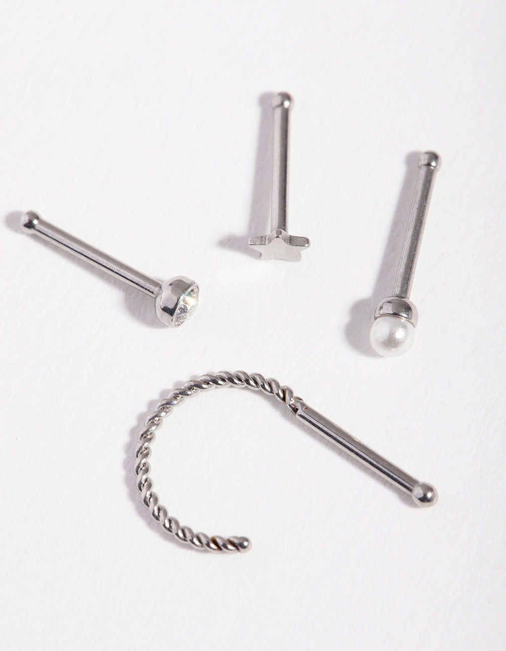Round out your body jewellery collection with a chic nose piercing pack! This set includes four silver-toned studs with faux pearl, star and diamante detailing. They have a gauge of 20 and are 0.8mm in length.