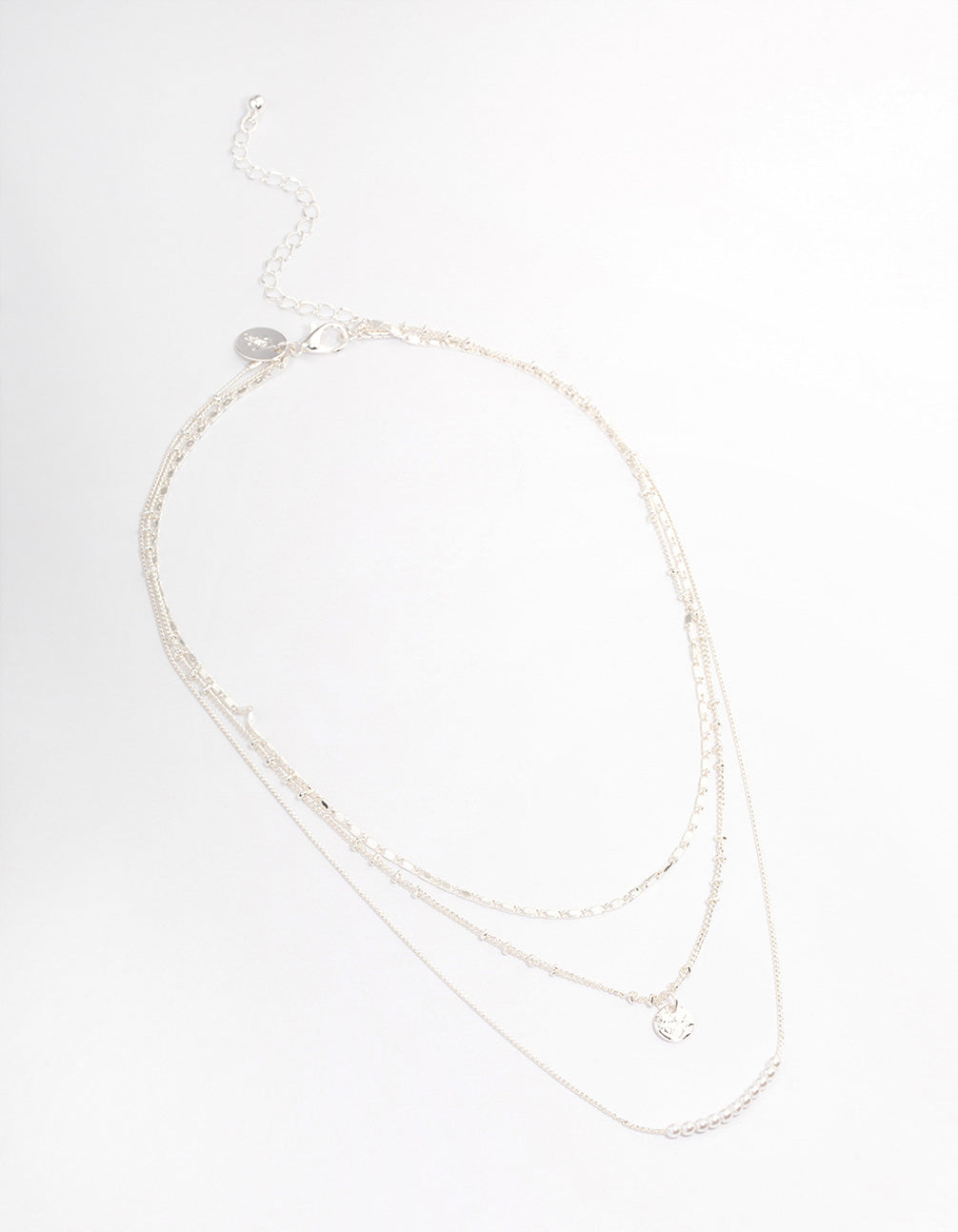 Style this silver-plated, triple layered necklace with a set of simple huggie hoops for a signature look. /p>