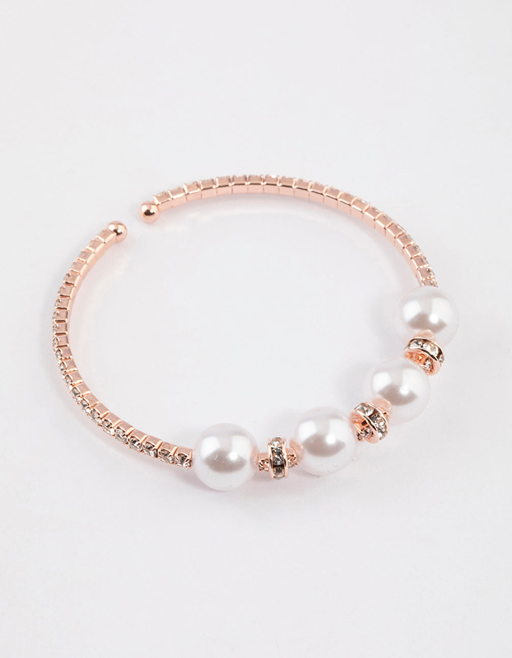 - This Rose Gold Pearl Diamante Bangle is adorned with delicate pearls and sparkling diamantes, perfect for adding an elegant touch to your ensemble.
