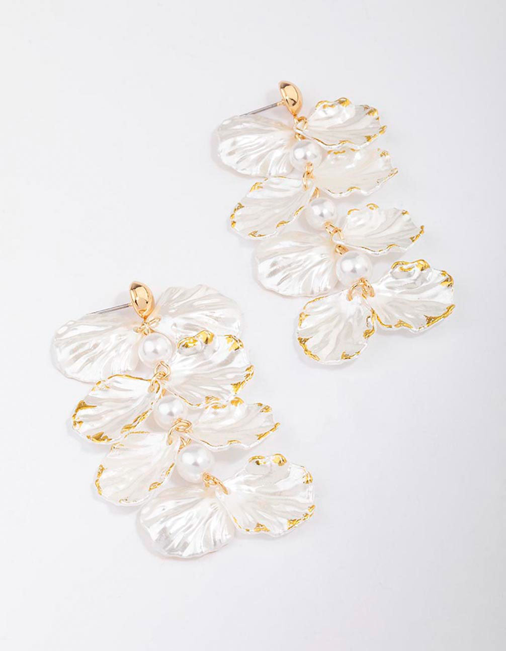 - Pair these gold-toned, pearlised petal drop earrings with a simple gold pendant necklace with floral motifs for a cohesive look.