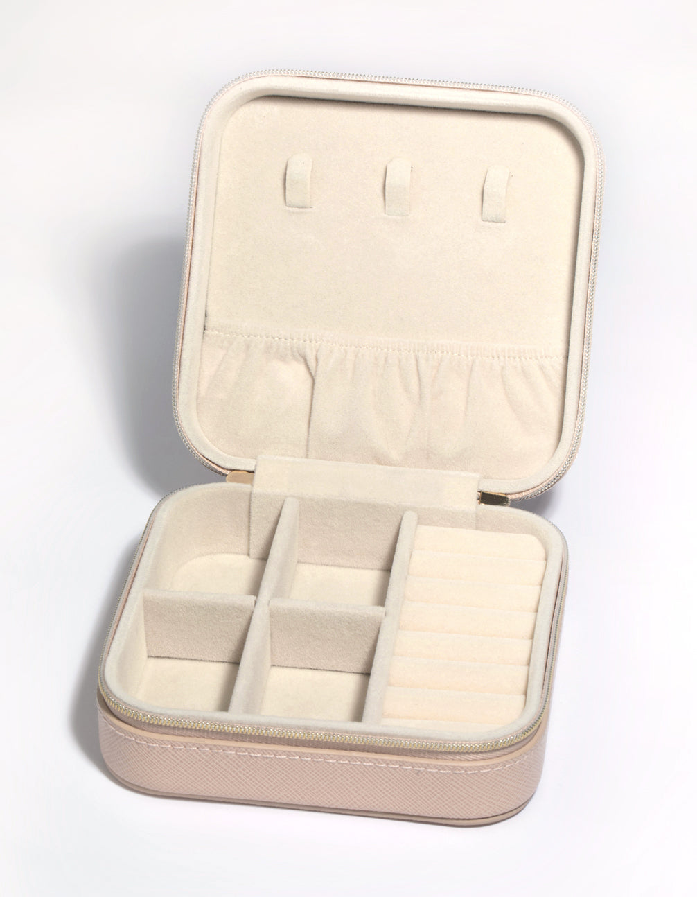 Meet your ultimate travel companion! This compact jewellery box is designed with a durable, blush faux leather exterior and features several compartments to store all your jewellery essentials.