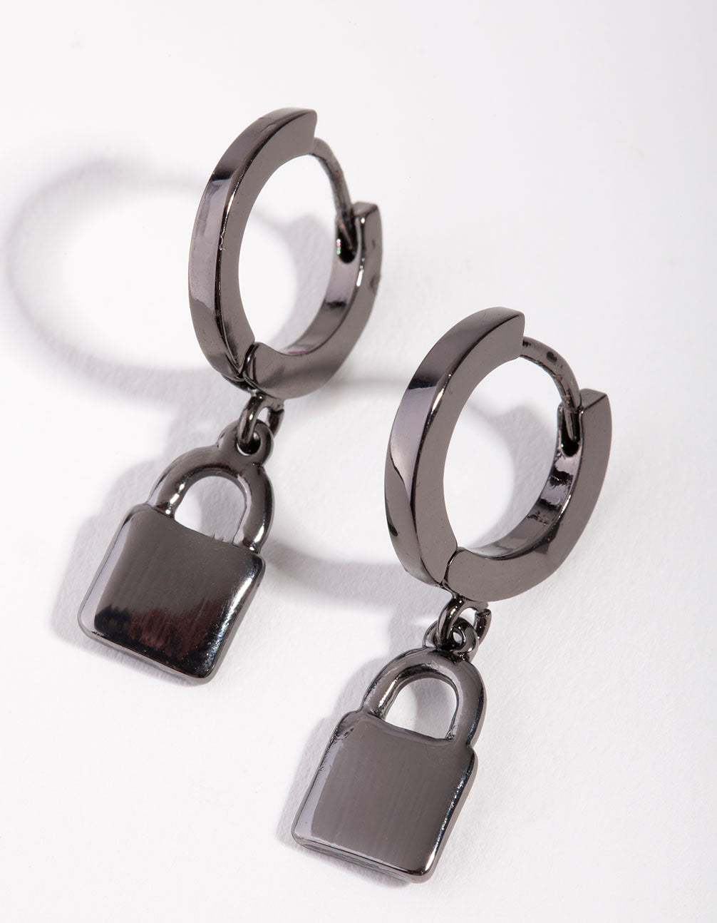 Stack it up or make a single statement with these black-toned huggie hoops! Features a small hoop with a padlock charm style.