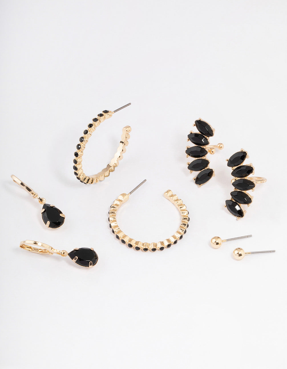 - Style this set of four stud and hoop earrings, designed with a gorgeous gold setting and embellished with black diamantes for added drama. For a cohesive look, explore adorning accessories from our Black on Black Collection.