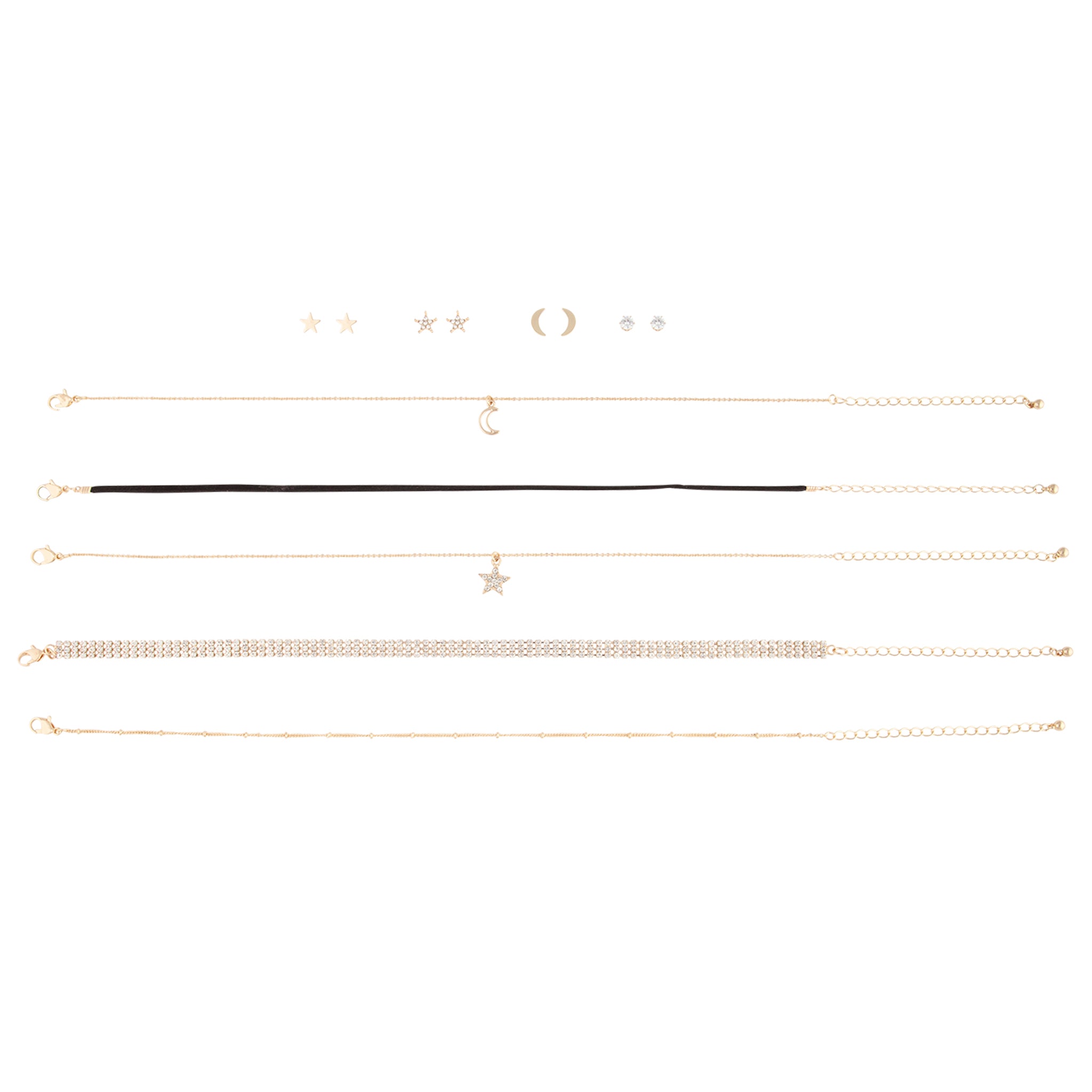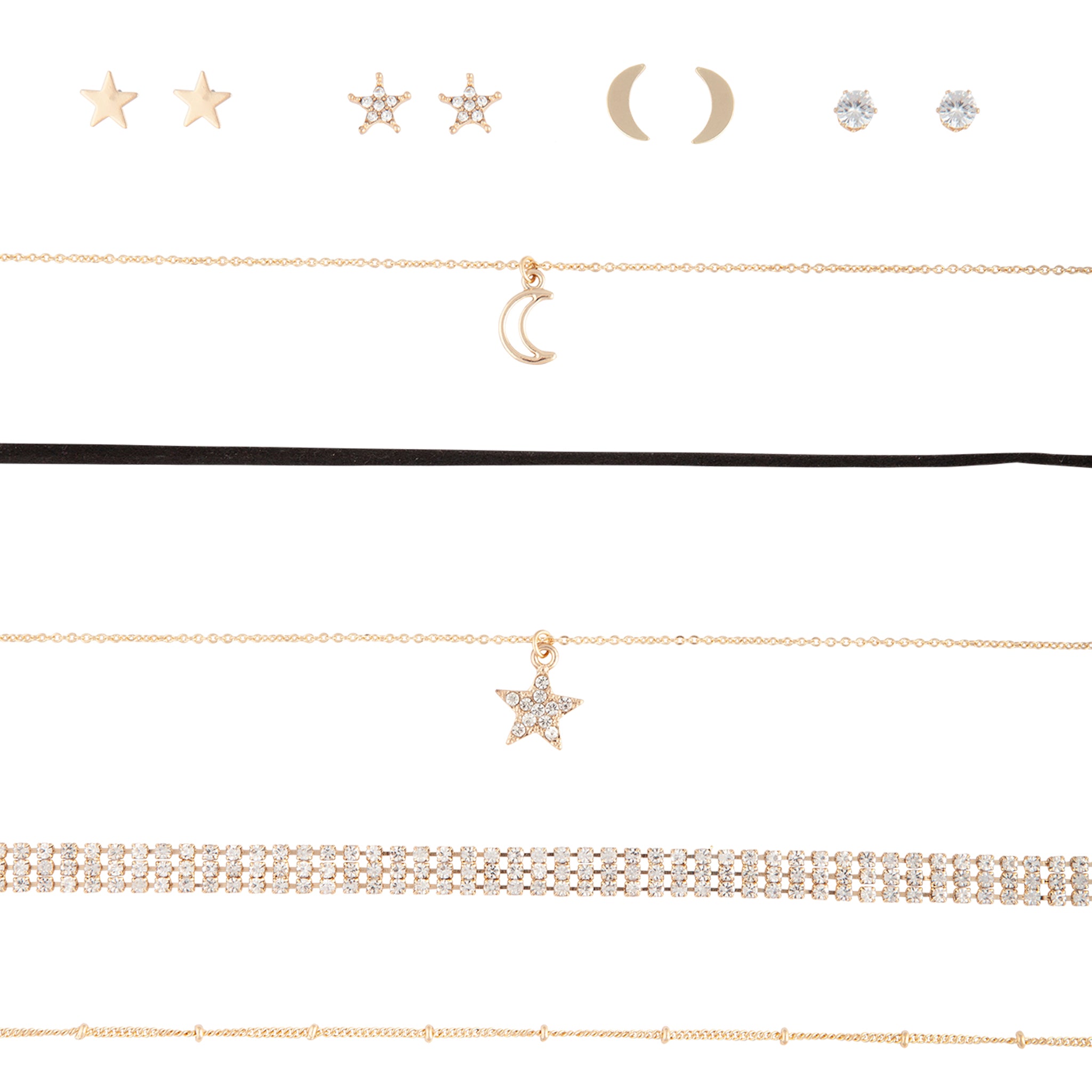This jewellery set comes with a variety of choker necklaces and stud earrings in a celestial design.