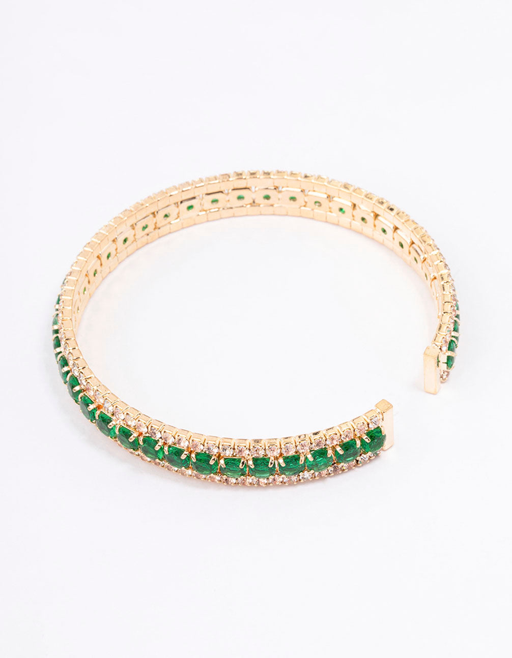 • This wrist cuff features emerald coloured, cubic zirconia crystals for an embellished finish.