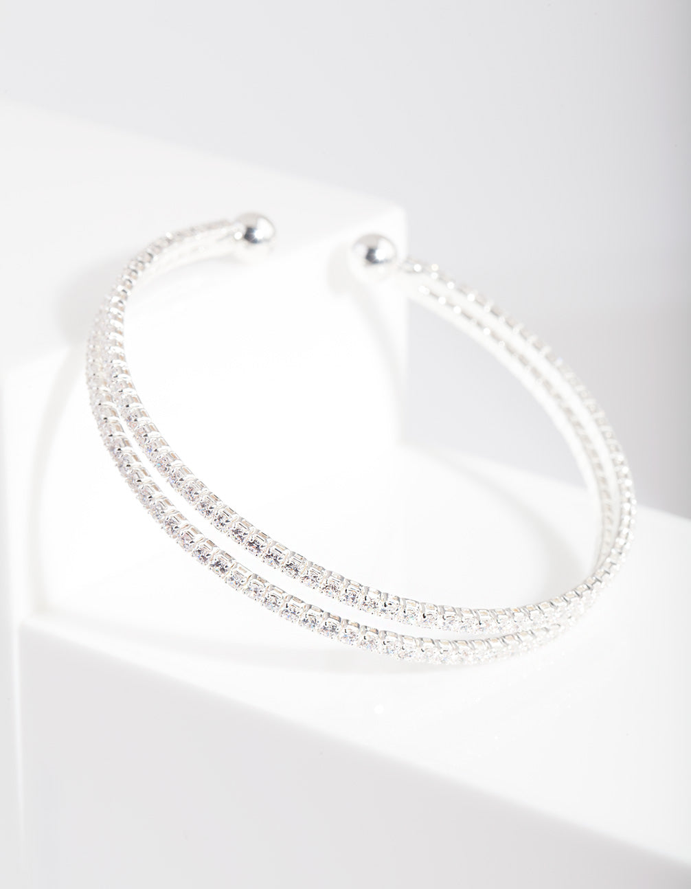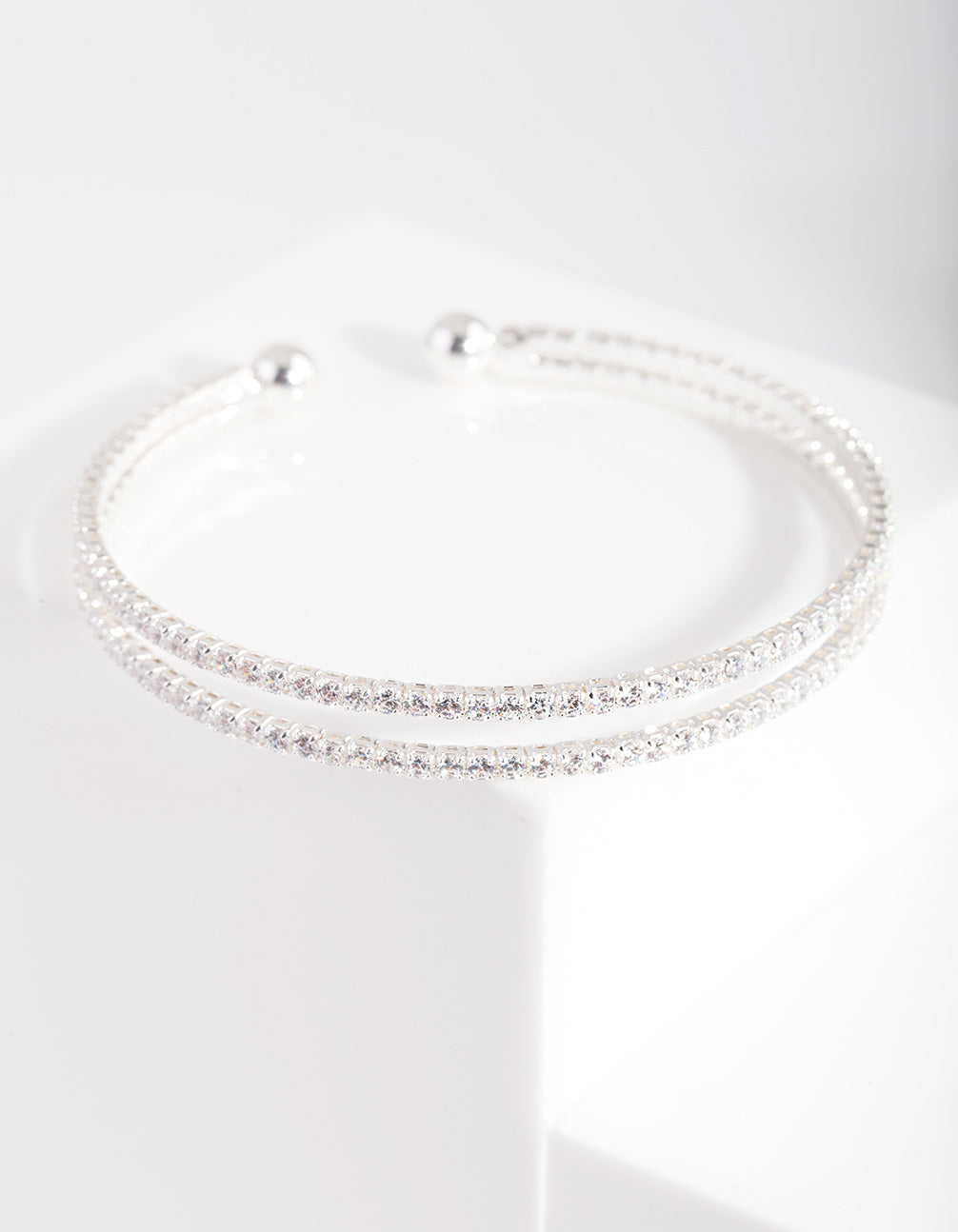 Cuffs can be worn so many ways. On the wrist as a classic bracelet/bangle or higher on the arm for a high fashion look. This silver-toned two row bracelet is embellished with cubic zirconia diamantes.
