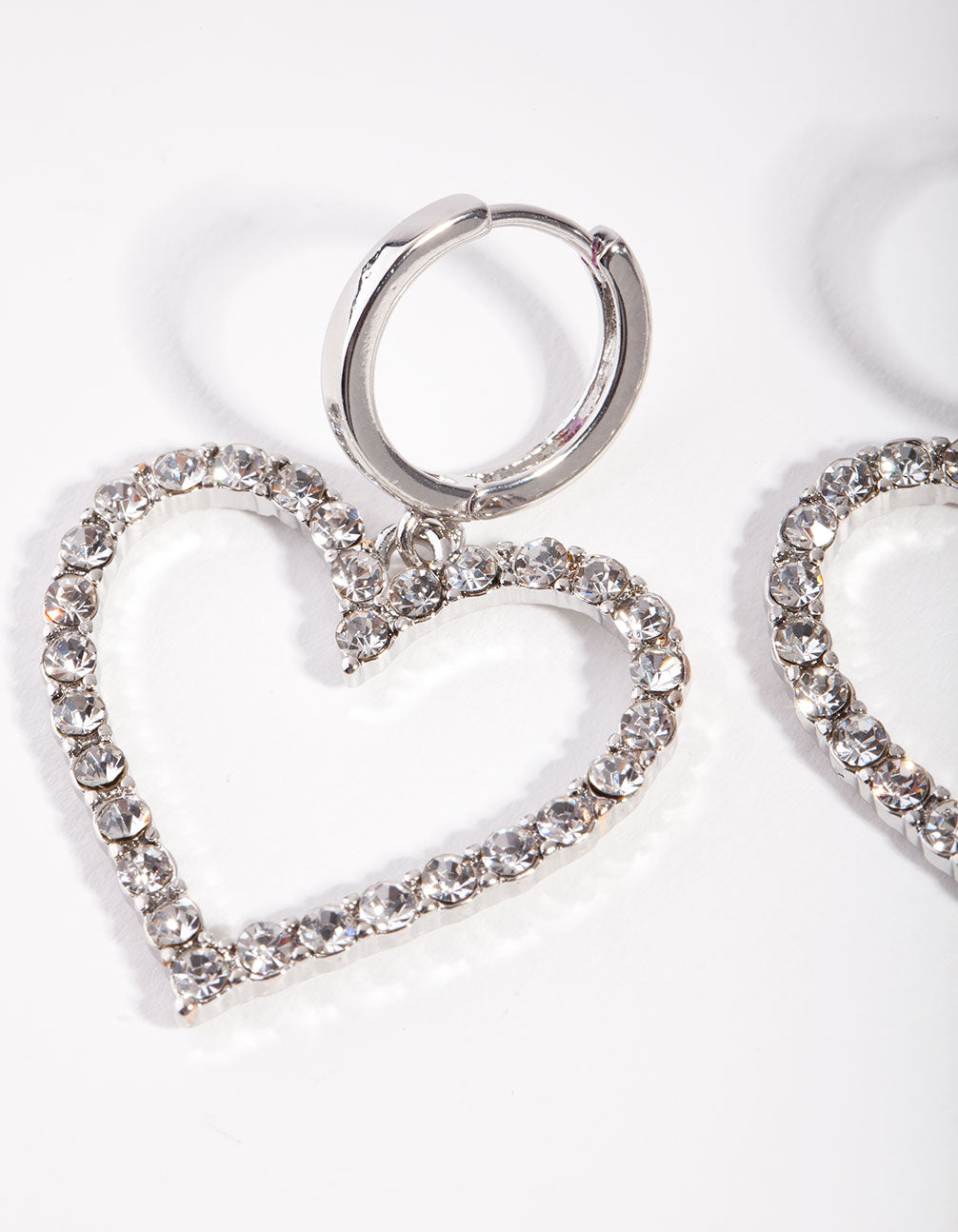 Go full 90s vibes with these diamante heart earrings. This hoop clasp earring features silver-tones and shiny diamantes. Add them to a casual look for something extra or go full glam and wear them with a dressier look.