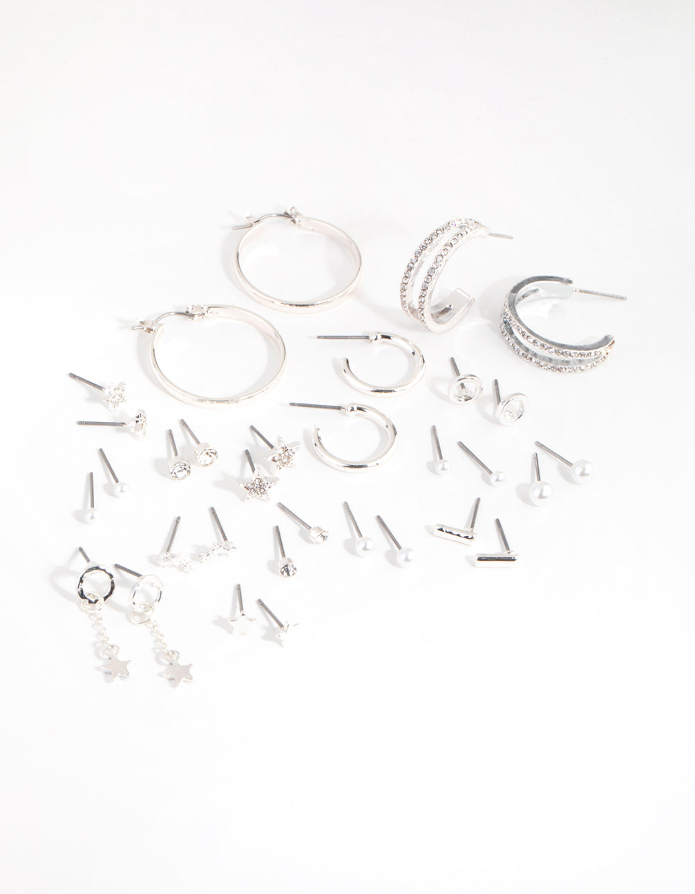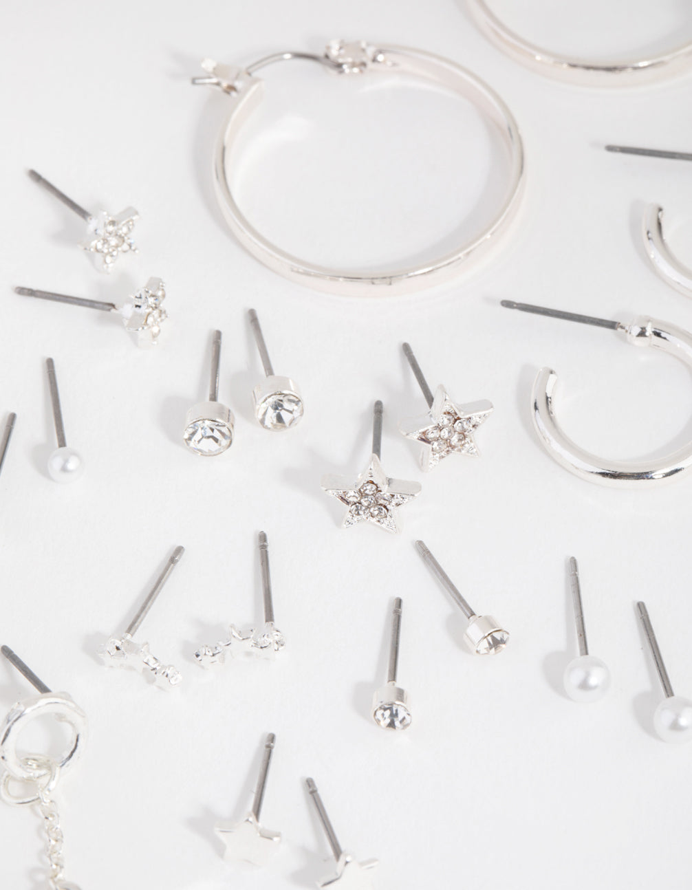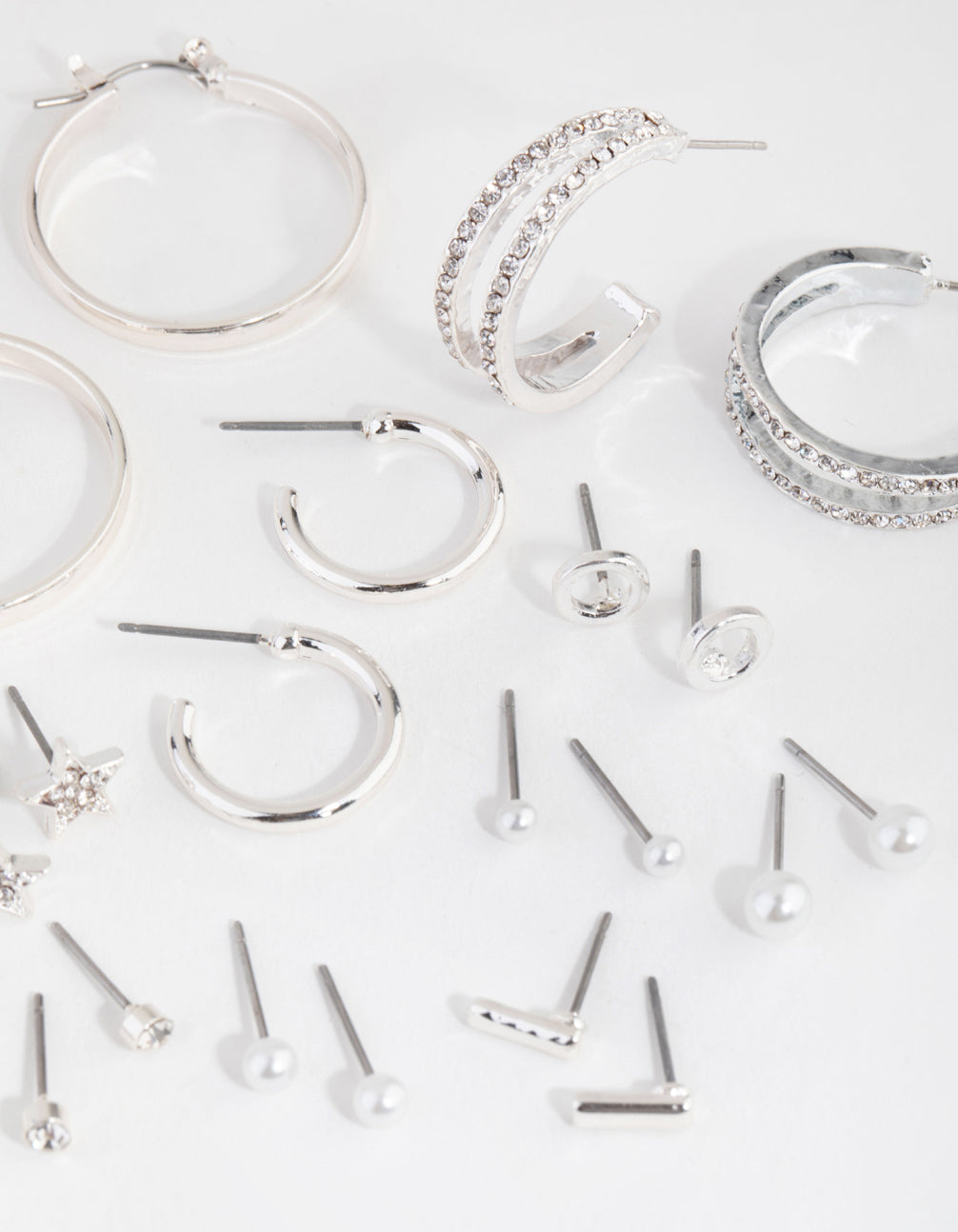Mix them, match them, stack them! This set comes with 16 pairs of earrings with a variety of motifs and designs. All of them are silver toned, and some feature faux pearl and diamante embellishments.
