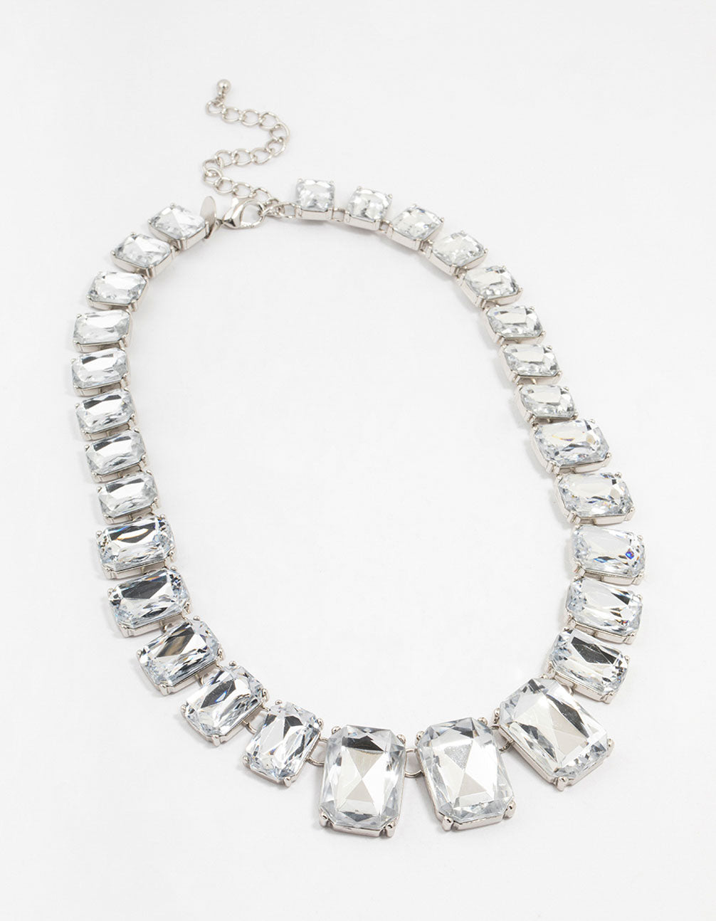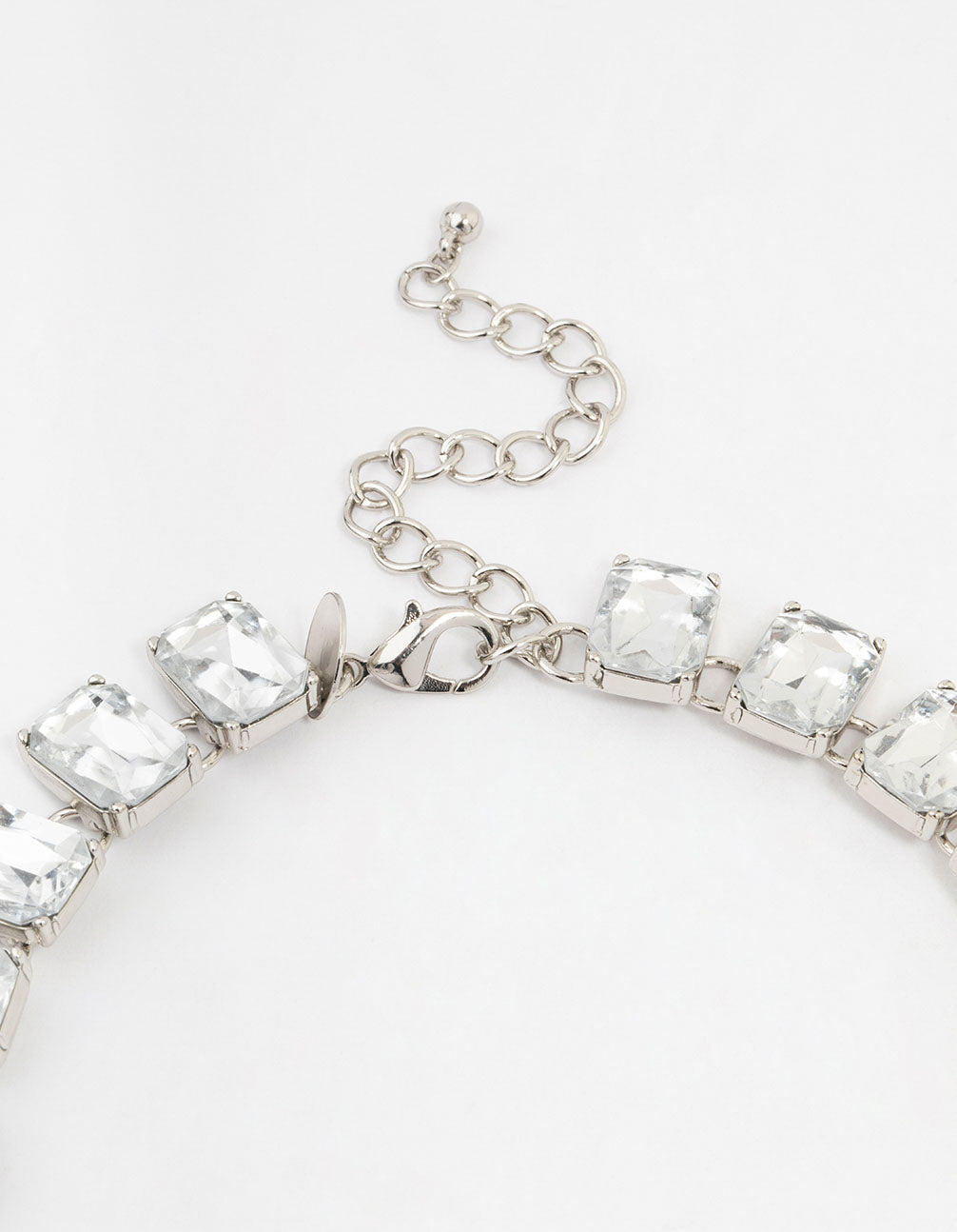 This beautiful silver plated chain necklace features a dazzling array of round cut diamante stones for a glamorous look. The short length makes it perfect to add just the right amount of sparkle.