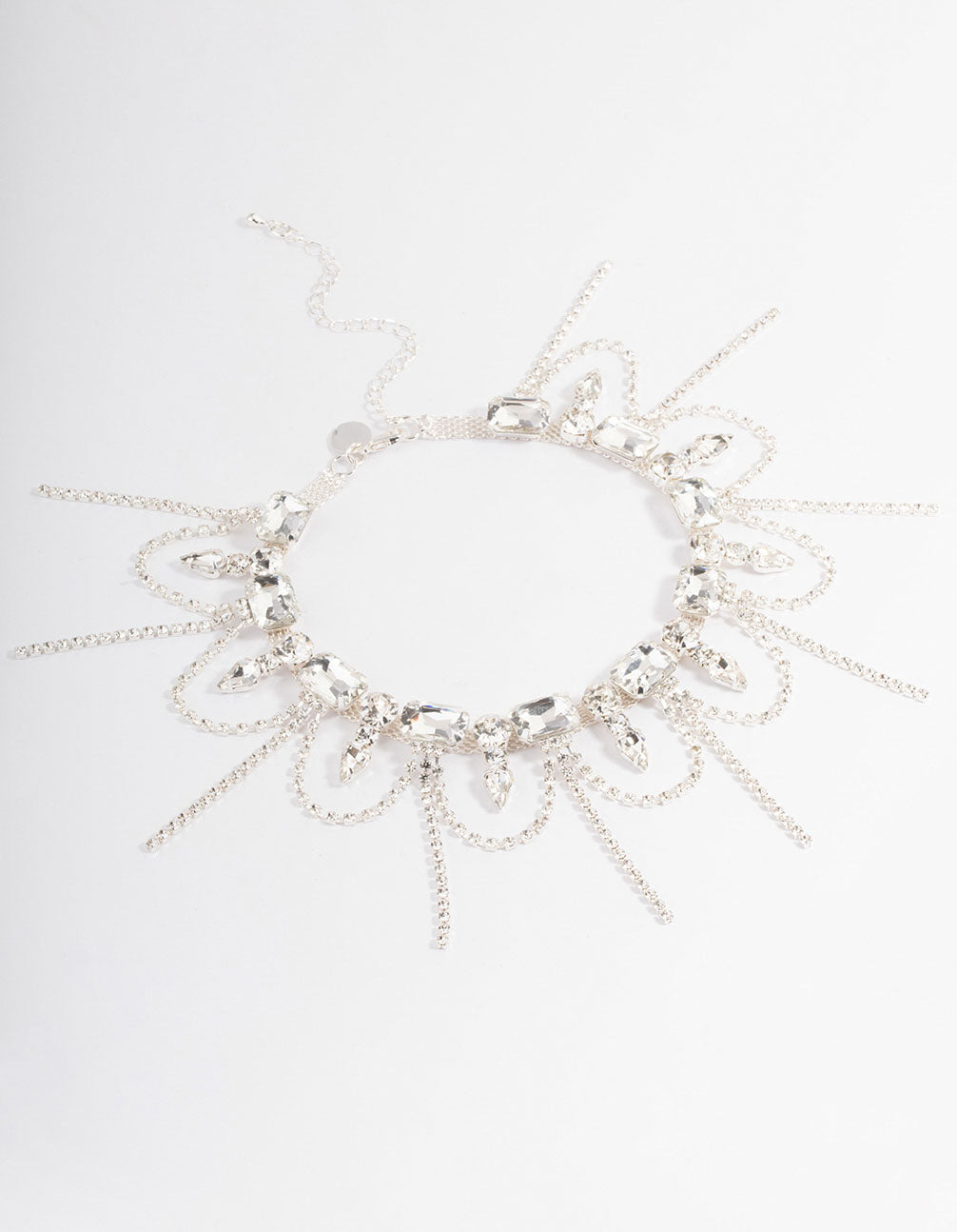 This silver, statement choker necklace features a collection of diamante stones and cascading strands for a multi-dimensional, embellished look. Style this choker necklace with a pair of crystal drop earrings, perfect for special occasions.