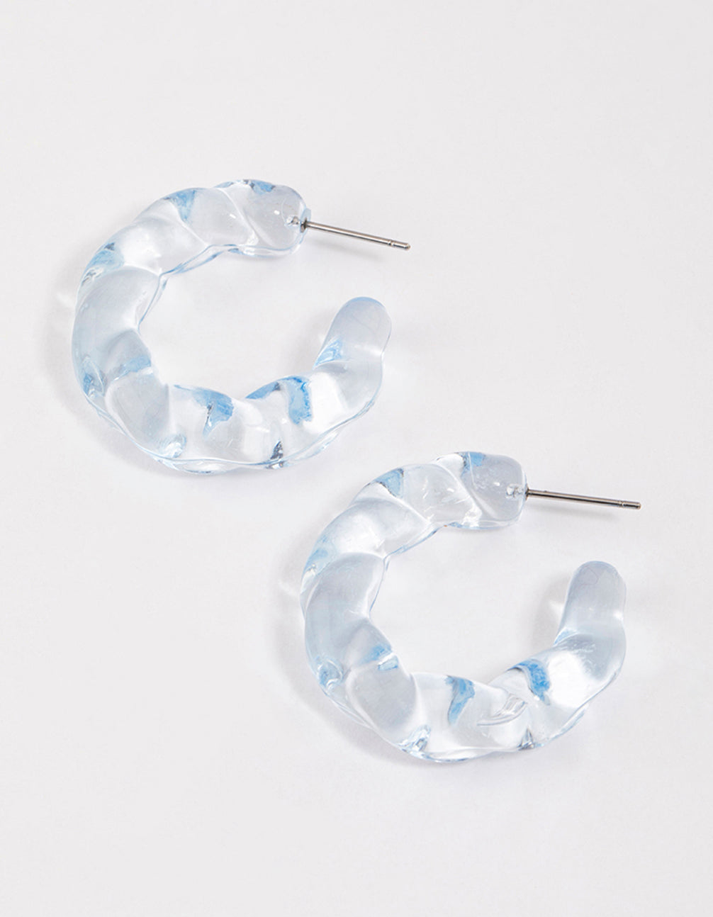 These unique, wavy shaped hoop earrings feature a transparent, blue-coloured acrylic with a wavy pattern - designed to mimic the look of clouds!