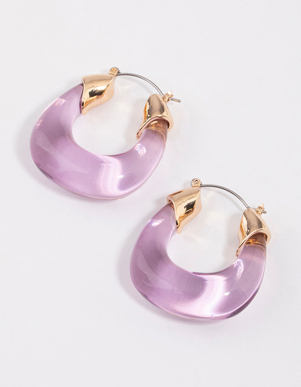 These unique hoop earrings feature a transparent, purple shape with a gold-toned setting.