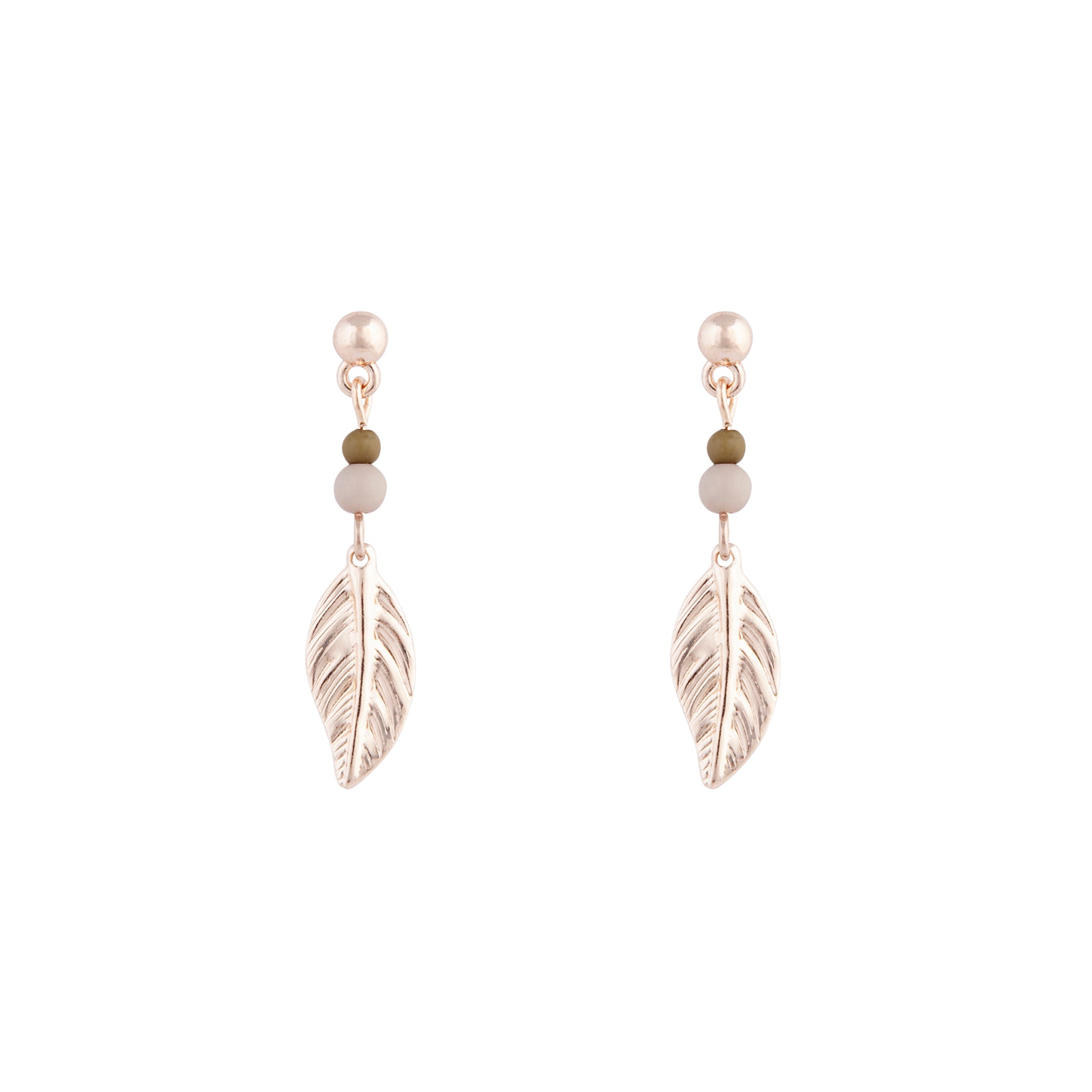 A pair of rose-gold-toned drop stud earrings with a textured leaf design and green and grey beads.