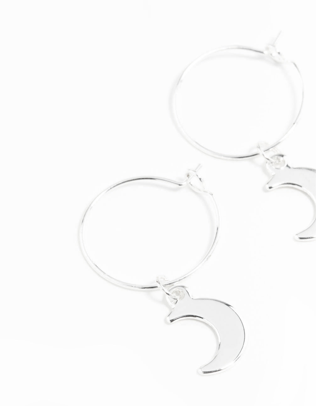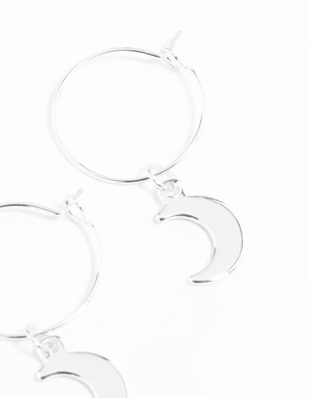These earrings boast a silver tone setting in a 13mm hoop design with a crescent moon pendant.