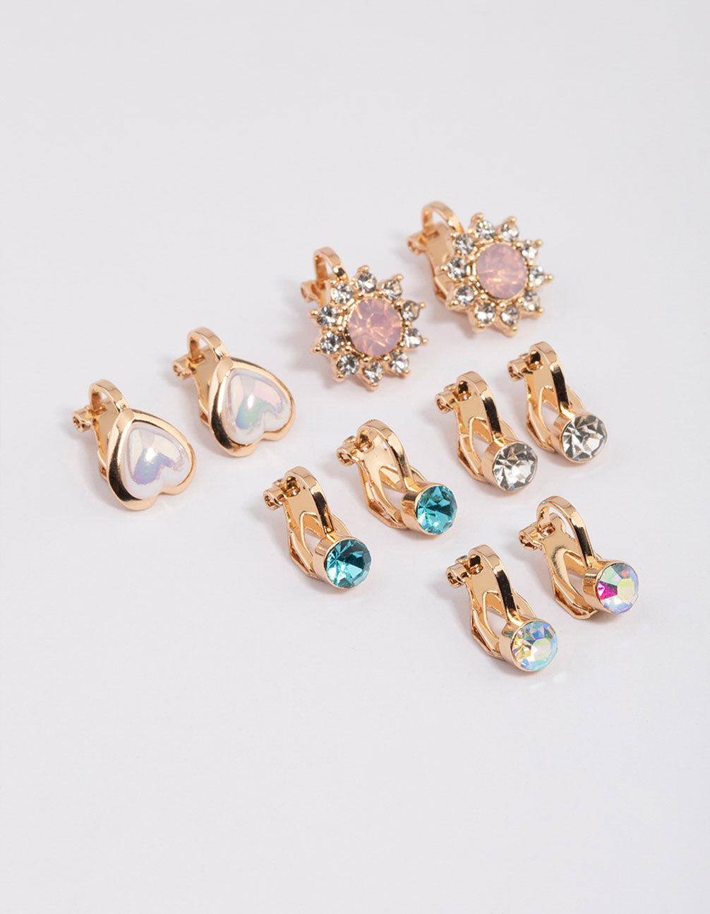 Gold Heart & Flower Clip On Earrings 5-Pack