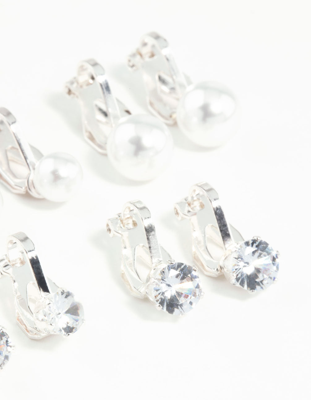 Silver Pearl & Diamante Clip On Earrings 5-Pack