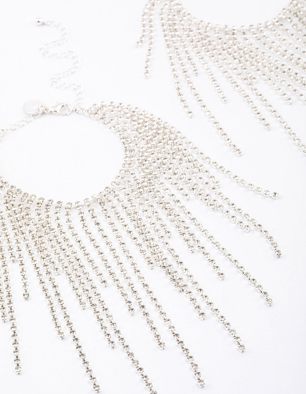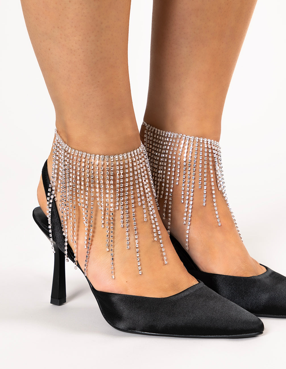 • Level up your look with this set of diamante, cupchain anklets. These anklets are designed with a waterfall of diamantes to add interest and glamour to a heel strap.
